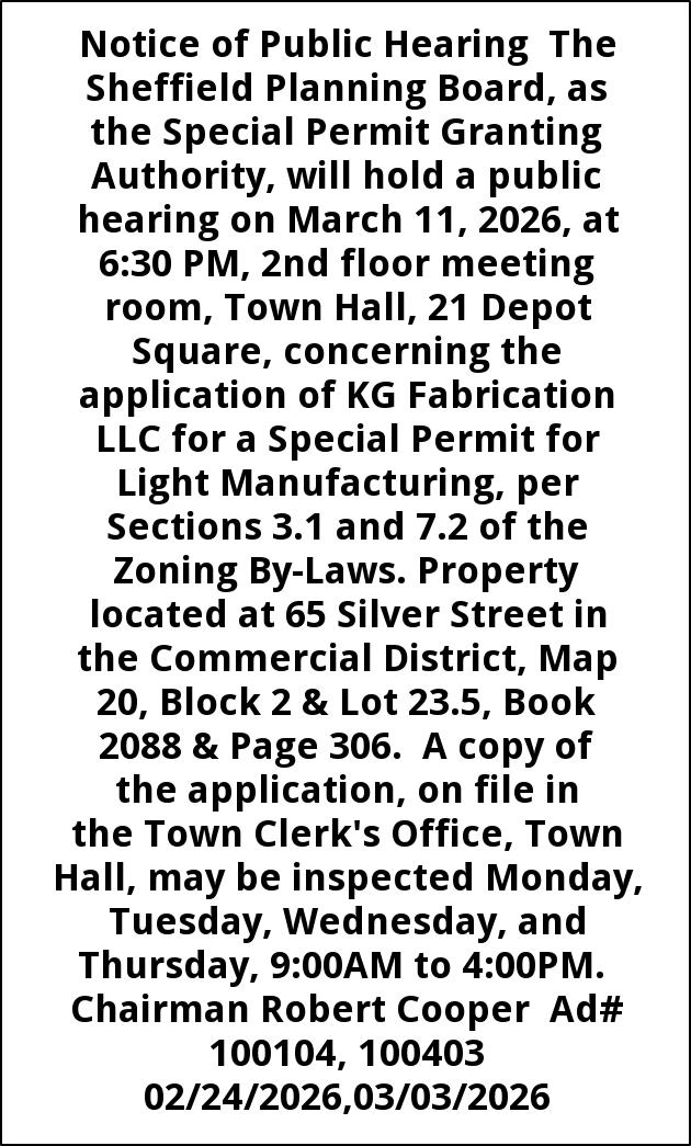 Notice of Public Hearing The Sheffield Planning Board, as the Special Permit Granting Authority, will hold a public hearing on March 11, 2026, at 6:30 PM, 2nd floor meeting room, Town Hall, 21 Depot Square, concerning the application of KG Fabrication LLC for a Special Permit for Light Manufacturing, per Sections 3.1 and 7.2 of the Zoning By-Laws. Property located at 65 Silver Street in the Commercial District, Map 20, Block 2 & Lot 23.5, Book 2088 & Page 306. A copy of the application, on file in the Town Clerk's Office, Town Hall, may be inspected Monday, Tuesday, Wednesday, and Thursday, 9:00AM to 4:00PM. Chairman Robert Cooper Ad# 100104, 100403 02/24/2026,03/03/2026