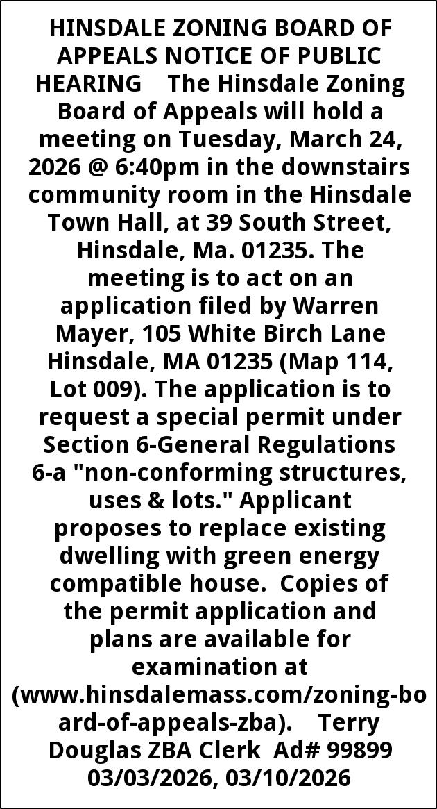HINSDALE ZONING BOARD OF APPEALS NOTICE OF PUBLIC HEARING The Hinsdale Zoning Board of Appeals will hold a meeting on Tuesday, March 24, 2026 @ 6:40pm in the downstairs community room in the Hinsdale Town Hall, at 39 South Street, Hinsdale, Ma. 01235. The meeting is to act on an application filed by Warren Mayer, 105 White Birch Lane Hinsdale, MA 01235 (Map 114, Lot 009). The application is to request a special permit under Section 6-General Regulations 6-a "non-conforming structures, uses & lots." Applicant proposes to replace existing dwelling with green energy compatible house. Copies of the permit application and plans are available for examination at (www.hinsdalemass.com/zoning-board-of-appeals-zba). Terry Douglas ZBA Clerk Ad# 99899 03/03/2026, 03/10/2026