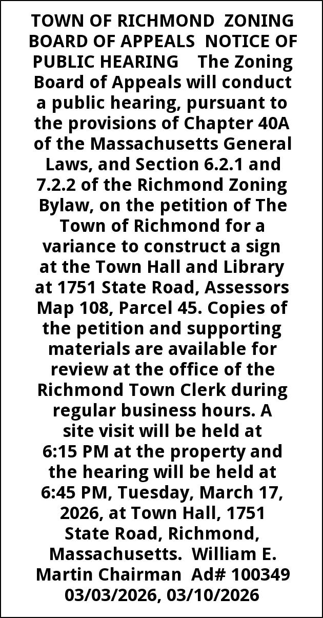 TOWN OF RICHMOND ZONING BOARD OF APPEALS NOTICE OF PUBLIC HEARING The Zoning Board of Appeals will conduct a public hearing, pursuant to the provisions of Chapter 40A of the Massachusetts General Laws, and Section 6.2.1 and 7.2.2 of the Richmond Zoning Bylaw, on the petition of The Town of Richmond for a variance to construct a sign at the Town Hall and Library at 1751 State Road, Assessors Map 108, Parcel 45. Copies of the petition and supporting materials are available for review at the office of the Richmond Town Clerk during regular business hours. A site visit will be held at 6:15 PM at the property and the hearing will be held at 6:45 PM, Tuesday, March 17, 2026, at Town Hall, 1751 State Road, Richmond, Massachusetts. William E. Martin Chairman Ad# 100349 03/03/2026, 03/10/2026