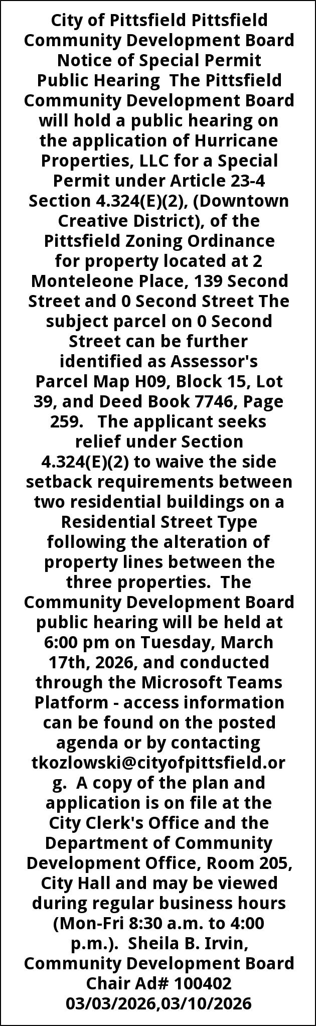 City of Pittsfield Pittsfield Community Development Board Notice of Special Permit Public Hearing The Pittsfield Community Development Board will hold a public hearing on the application of Hurricane Properties, LLC for a Special Permit under Article 23-4 Section 4.324(E)(2), (Downtown Creative District), of the Pittsfield Zoning Ordinance for property located at 2 Monteleone Place, 139 Second Street and 0 Second Street The subject parcel on 0 Second Street can be further identified as Assessor's Parcel Map H09, Block 15, Lot 39, and Deed Book 7746, Page 259. The applicant seeks relief under Section 4.324(E)(2) to waive the side setback requirements between two residential buildings on a Residential Street Type following the alteration of property lines between the three properties. The Community Development Board public hearing will be held at 6:00 pm on Tuesday, March 17th, 2026, and conducted through the Microsoft Teams Platform - access information can be found on the posted agenda or by contacting tkozlowski@cityofpittsfield.org. A copy of the plan and application is on file at the City Clerk's Office and the Department of Community Development Office, Room 205, City Hall and may be viewed during regular business hours (Mon-Fri 8:30 a.m. to 4:00 p.m.). Sheila B. Irvin, Community Development Board Chair Ad# 100402 03/03/2026,03/10/2026