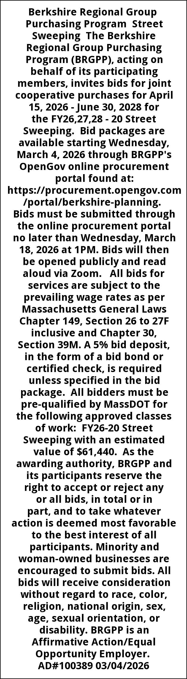 Berkshire Regional Group Purchasing Program Street Sweeping The Berkshire Regional Group Purchasing Program (BRGPP), acting on behalf of its participating members, invites bids for joint cooperative purchases for April 15, 2026 - June 30, 2028 for the FY26,27,28 - 20 Street Sweeping. Bid packages are available starting Wednesday, March 4, 2026 through BRGPP's OpenGov online procurement portal found at: https://procurement.opengov.com/portal/berkshire-planning. Bids must be submitted through the online procurement portal no later than Wednesday, March 18, 2026 at 1PM. Bids will then be opened publicly and read aloud via Zoom. All bids for services are subject to the prevailing wage rates as per Massachusetts General Laws Chapter 149, Section 26 to 27F inclusive and Chapter 30, Section 39M. A 5% bid deposit, in the form of a bid bond or certified check, is required unless specified in the bid package. All bidders must be pre-qualified by MassDOT for the following approved classes of work: FY26-20 Street Sweeping with an estimated value of $61,440. As the awarding authority, BRGPP and its participants reserve the right to accept or reject any or all bids, in total or in part, and to take whatever action is deemed most favorable to the best interest of all participants. Minority and woman-owned businesses are encouraged to submit bids. All bids will receive consideration without regard to race, color, religion, national origin, sex, age, sexual orientation, or disability. BRGPP is an Affirmative Action/Equal Opportunity Employer. AD#100389 03/04/2026