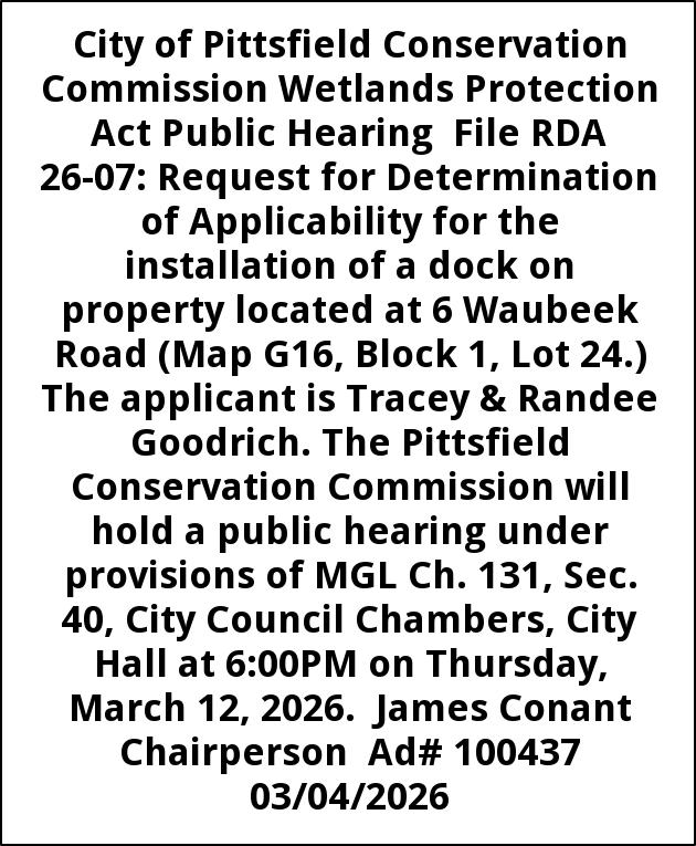 City of Pittsfield Conservation Commission Wetlands Protection Act Public Hearing File RDA 26-07: Request for Determination of Applicability for the installation of a dock on property located at 6 Waubeek Road (Map G16, Block 1, Lot 24.) The applicant is Tracey & Randee Goodrich. The Pittsfield Conservation Commission will hold a public hearing under provisions of MGL Ch. 131, Sec. 40, City Council Chambers, City Hall at 6:00PM on Thursday, March 12, 2026. James Conant Chairperson Ad# 100437 03/04/2026