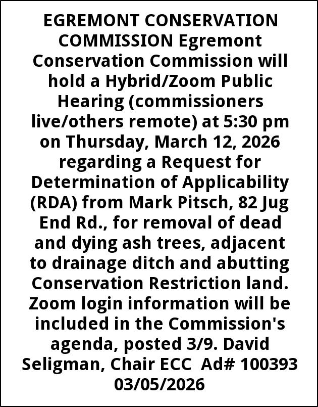 EGREMONT CONSERVATION COMMISSION Egremont Conservation Commission will hold a Hybrid/Zoom Public Hearing (commissioners live/others remote) at 5:30 pm on Thursday, March 12, 2026 regarding a Request for Determination of Applicability (RDA) from Mark Pitsch, 82 Jug End Rd., for removal of dead and dying ash trees, adjacent to drainage ditch and abutting Conservation Restriction land. Zoom login information will be included in the Commission's agenda, posted 3/9. David Seligman, Chair ECC Ad# 100393 03/05/2026