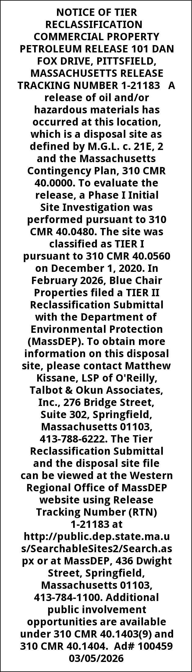 NOTICE OF TIER RECLASSIFICATION COMMERCIAL PROPERTY PETROLEUM RELEASE 101 DAN FOX DRIVE, PITTSFIELD, MASSACHUSETTS RELEASE TRACKING NUMBER 1-21183 A release of oil and/or hazardous materials has occurred at this location, which is a disposal site as defined by M.G.L. c. 21E, 2 and the Massachusetts Contingency Plan, 310 CMR 40.0000. To evaluate the release, a Phase I Initial Site Investigation was performed pursuant to 310 CMR 40.0480. The site was classified as TIER I pursuant to 310 CMR 40.0560 on December 1, 2020. In February 2026, Blue Chair Properties filed a TIER II Reclassification Submittal with the Department of Environmental Protection (MassDEP). To obtain more information on this disposal site, please contact Matthew Kissane, LSP of O'Reilly, Talbot & Okun Associates, Inc., 276 Bridge Street, Suite 302, Springfield, Massachusetts 01103, 413-788-6222. The Tier Reclassification Submittal and the disposal site file can be viewed at the Western Regional Office of MassDEP website using Release Tracking Number (RTN) 1-21183 at http://public.dep.state.ma.us/SearchableSites2/Search.aspx or at MassDEP, 436 Dwight Street, Springfield, Massachusetts 01103, 413-784-1100. Additional public involvement opportunities are available under 310 CMR 40.1403(9) and 310 CMR 40.1404. Ad# 100459 03/05/2026