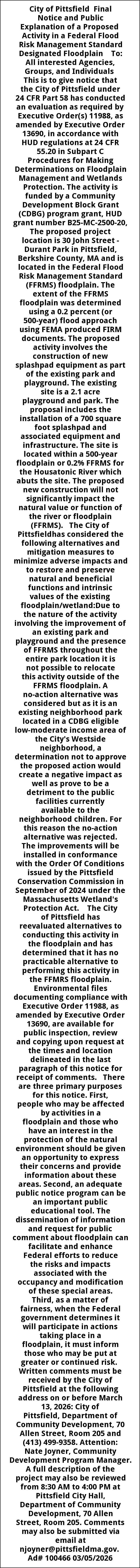 City of Pittsfield Final Notice and Public Explanation of a Proposed Activity in a Federal Flood Risk Management Standard Designated Floodplain To: All interested Agencies, Groups, and Individuals This is to give notice that the City of Pittsfield under 24 CFR Part 58 has conducted an evaluation as required by Executive Order(s) 11988, as amended by Executive Order 13690, in accordance with HUD regulations at 24 CFR 55.20 in Subpart C Procedures for Making Determinations on Floodplain Management and Wetlands Protection. The activity is funded by a Community Development Block Grant (CDBG) program grant, HUD grant number B25-MC-2500-20, The proposed project location is 30 John Street - Durant Park in Pittsfield, Berkshire County, MA and is located in the Federal Flood Risk Management Standard (FFRMS) floodplain. The extent of the FFRMS floodplain was determined using a 0.2 percent (or 500-year) flood approach using FEMA produced FIRM documents. The proposed activity involves the construction of new splashpad equipment as part of the existing park and playground. The existing site is a 2.1 acre playground and park. The proposal includes the installation of a 700 square foot splashpad and associated equipment and infrastructure. The site is located within a 500-year floodplain or 0.2% FFRMS for the Housatonic River which abuts the site. The proposed new construction will not significantly impact the natural value or function of the river or floodplain (FFRMS). The City of Pittsfieldhas considered the following alternatives and mitigation measures to minimize adverse impacts and to restore and preserve natural and beneficial functions and intrinsic values of the existing floodplain/wetland:Due to the nature of the activity involving the improvement of an existing park and playground and the presence of FFRMS throughout the entire park location it is not possible to relocate this activity outside of the FFRMS floodplain. A no-action alternative was considered but as it is an existing neighborhood park located in a CDBG eligible low-moderate income area of the City's Westside neighborhood, a determination not to approve the proposed action would create a negative impact as well as prove to be a detriment to the public facilities currently available to the neighborhood children. For this reason the no-action alternative was rejected. The improvements will be installed in conformance with the Order Of Conditions issued by the Pittsfield Conservation Commission in September of 2024 under the Massachusetts Wetland's Protection Act. The City of Pittsfield has reevaluated alternatives to conducting this activity in the floodplain and has determined that it has no practicable alternative to performing this activity in the FFMRS floodplain. Environmental files documenting compliance with Executive Order 11988, as amended by Executive Order 13690, are available for public inspection, review and copying upon request at the times and location delineated in the last paragraph of this notice for receipt of comments. There are three primary purposes for this notice. First, people who may be affected by activities in a floodplain and those who have an interest in the protection of the natural environment should be given an opportunity to express their concerns and provide information about these areas. Second, an adequate public notice program can be an important public educational tool. The dissemination of information and request for public comment about floodplain can facilitate and enhance Federal efforts to reduce the risks and impacts associated with the occupancy and modification of these special areas. Third, as a matter of fairness, when the Federal government determines it will participate in actions taking place in a floodplain, it must inform those who may be put at greater or continued risk. Written comments must be received by the City of Pittsfield at the following address on or before March 13, 2026: City of Pittsfield, Department of Community Development, 70 Allen Street, Room 205 and (413) 499-9358. Attention: Nate Joyner, Community Development Program Manager. A full description of the project may also be reviewed from 8:30 AM to 4:00 PM at Pittsfield City Hall, Department of Community Development, 70 Allen Street, Room 205. Comments may also be submitted via email at njoyner@pittsfieldma.gov. Ad# 100466 03/05/2026