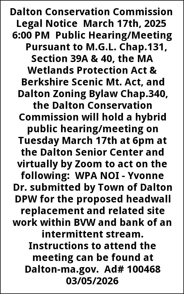Dalton Conservation Commission Legal Notice March 17th, 2025 6:00 PM Public Hearing/Meeting Pursuant to M.G.L. Chap.131, Section 39A & 40, the MA Wetlands Protection Act & Berkshire Scenic Mt. Act, and Dalton Zoning Bylaw Chap.340, the Dalton Conservation Commission will hold a hybrid public hearing/meeting on Tuesday March 17th at 6pm at the Dalton Senior Center and virtually by Zoom to act on the following: WPA NOI - Yvonne Dr. submitted by Town of Dalton DPW for the proposed headwall replacement and related site work within BVW and bank of an intermittent stream. Instructions to attend the meeting can be found at Dalton-ma.gov. Ad# 100468 03/05/2026