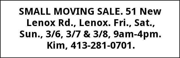 SMALL MOVING SALE. 51 New Lenox Rd., Lenox. Fri., Sat., Sun., 3/6, 3/7 & 3/8, 9am-4pm. Kim, 413-281-0701.