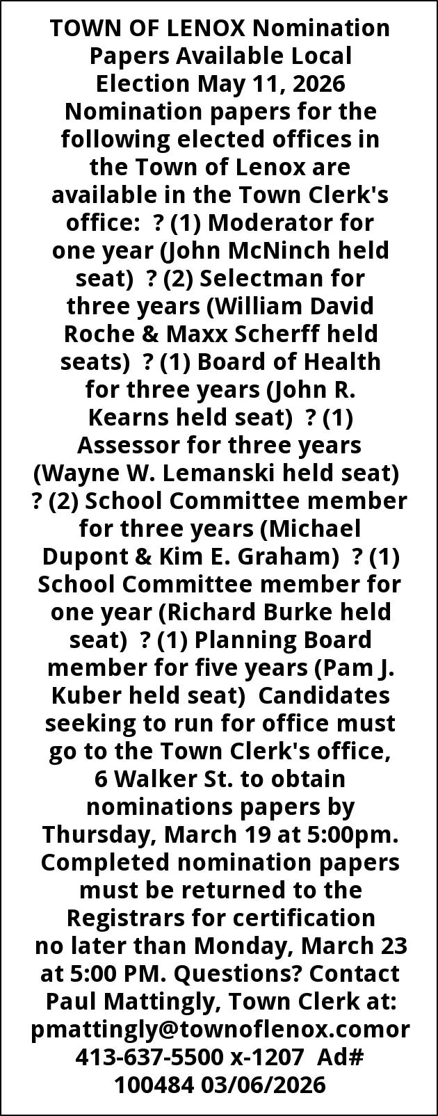 TOWN OF LENOX Nomination Papers Available Local Election May 11, 2026 Nomination papers for the following elected offices in the Town of Lenox are available in the Town Clerk's office: ? (1) Moderator for one year (John McNinch held seat) ? (2) Selectman for three years (William David Roche & Maxx Scherff held seats) ? (1) Board of Health for three years (John R. Kearns held seat) ? (1) Assessor for three years (Wayne W. Lemanski held seat) ? (2) School Committee member for three years (Michael Dupont & Kim E. Graham) ? (1) School Committee member for one year (Richard Burke held seat) ? (1) Planning Board member for five years (Pam J. Kuber held seat) Candidates seeking to run for office must go to the Town Clerk's office, 6 Walker St. to obtain nominations papers by Thursday, March 19 at 5:00pm. Completed nomination papers must be returned to the Registrars for certification no later than Monday, March 23 at 5:00 PM. Questions? Contact Paul Mattingly, Town Clerk at: pmattingly@townoflenox.comor 413-637-5500 x-1207 Ad# 100484 03/06/2026