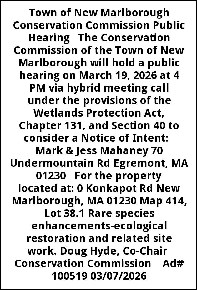 Town of New Marlborough Conservation Commission Public Hearing The Conservation Commission of the Town of New Marlborough will hold a public hearing on March 19, 2026 at 4 PM via hybrid meeting call under the provisions of the Wetlands Protection Act, Chapter 131, and Section 40 to consider a Notice of Intent: Mark & Jess Mahaney 70 Undermountain Rd Egremont, MA 01230 For the property located at: 0 Konkapot Rd New Marlborough, MA 01230 Map 414, Lot 38.1 Rare species enhancements-ecological restoration and related site work. Doug Hyde, Co-Chair Conservation Commission Ad# 100519 03/07/2026