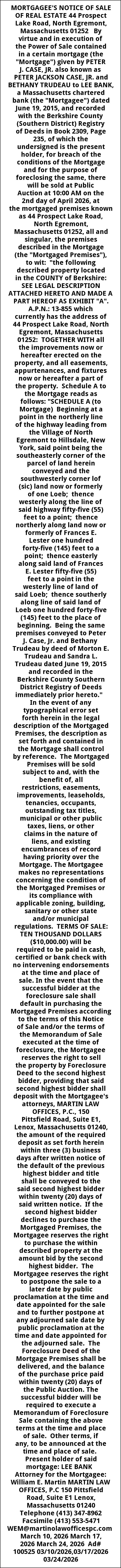 MORTGAGEE'S NOTICE OF SALE OF REAL ESTATE 44 Prospect Lake Road, North Egremont, Massachusetts 01252 By virtue and in execution of the Power of Sale contained in a certain mortgage (the "Mortgage") given by PETER J. CASE, JR. also known as PETER JACKSON CASE, JR. and BETHANY TRUDEAU to LEE BANK, a Massachusetts chartered bank (the "Mortgagee") dated June 19, 2015, and recorded with the Berkshire County (Southern District) Registry of Deeds in Book 2309, Page 235, of which the undersigned is the present holder, for breach of the conditions of the Mortgage and for the purpose of foreclosing the same, there will be sold at Public Auction at 10:00 AM on the 2nd day of April 2026, at the mortgaged premises known as 44 Prospect Lake Road, North Egremont, Massachusetts 01252, all and singular, the premises described in the Mortgage (the "Mortgaged Premises"), to wit: "the following described property located in the COUNTY of Berkshire: SEE LEGAL DESCRIPTION ATTACHED HERETO AND MADE A PART HEREOF AS EXHIBIT "A". A.P.N.: 13-855 which currently has the address of 44 Prospect Lake Road, North Egremont, Massachusetts 01252: TOGETHER WITH all the improvements now or hereafter erected on the property, and all easements, appurtenances, and fixtures now or hereafter a part of the property. Schedule A to the Mortgage reads as follows: "SCHEDULE A (to Mortgage) Beginning at a point in the northerly line of the highway leading from the Village of North Egremont to Hillsdale, New York, said point being the southeasterly corner of the parcel of land herein conveyed and the southwesterly corner lof (sic) land now or formerly of one Loeb; thence westerly along the line of said highway fifty-five (55) feet to a point; thence northerly along land now or formerly of Frances E. Lester one hundred forty-five (145) feet to a point; thence easterly along said land of Frances E. Lester fifty-five (55) feet to a point in the westerly line of land of said Loeb; thence southerly along line of said land of Loeb one hundred forty-five (145) feet to the place of beginning. Being the same premises conveyed to Peter J. Case, Jr. and Bethany Trudeau by deed of Morton E. Trudeau and Sandra L. Trudeau dated June 19, 2015 and recorded in the Berkshire County Southern District Registry of Deeds immediately prior hereto." In the event of any typographical error set forth herein in the legal description of the Mortgaged Premises, the description as set forth and contained in the Mortgage shall control by reference. The Mortgaged Premises will be sold subject to and, with the benefit of, all restrictions, easements, improvements, leaseholds, tenancies, occupants, outstanding tax titles, municipal or other public taxes, liens, or other claims in the nature of liens, and existing encumbrances of record having priority over the Mortgage. The Mortgagee makes no representations concerning the condition of the Mortgaged Premises or its compliance with applicable zoning, building, sanitary or other state and/or municipal regulations. TERMS OF SALE: TEN THOUSAND DOLLARS ($10,000.00) will be required to be paid in cash, certified or bank check with no intervening endorsements at the time and place of sale. In the event that the successful bidder at the foreclosure sale shall default in purchasing the Mortgaged Premises according to the terms of this Notice of Sale and/or the terms of the Memorandum of Sale executed at the time of foreclosure, the Mortgagee reserves the right to sell the property by Foreclosure Deed to the second highest bidder, providing that said second highest bidder shall deposit with the Mortgagee's attorneys, MARTIN LAW OFFICES, P.C., 150 Pittsfield Road, Suite E1, Lenox, Massachusetts 01240, the amount of the required deposit as set forth herein within three (3) business days after written notice of the default of the previous highest bidder and title shall be conveyed to the said second highest bidder within twenty (20) days of said written notice. If the second highest bidder declines to purchase the Mortgaged Premises, the Mortgagee reserves the right to purchase the within described property at the amount bid by the second highest bidder. The Mortgagee reserves the right to postpone the sale to a later date by public proclamation at the time and date appointed for the sale and to further postpone at any adjourned sale date by public proclamation at the time and date appointed for the adjourned sale. The Foreclosure Deed of the Mortgage Premises shall be delivered, and the balance of the purchase price paid within twenty (20) days of the Public Auction. The successful bidder will be required to execute a Memorandum of Foreclosure Sale containing the above terms at the time and place of sale. Other terms, if any, to be announced at the time and place of sale. Present holder of said mortgage: LEE BANK Attorney for the Mortgagee: William E. Martin MARTIN LAW OFFICES, P.C 150 Pittsfield Road, Suite E1 Lenox, Massachusetts 01240 Telephone (413) 347-8962 Facsimile (413) 553-5471 WEM@martinolawofficespc.com March 10, 2026 March 17, 2026 March 24, 2026 Ad# 100525 03/10/2026,03/17/2026 03/24/2026