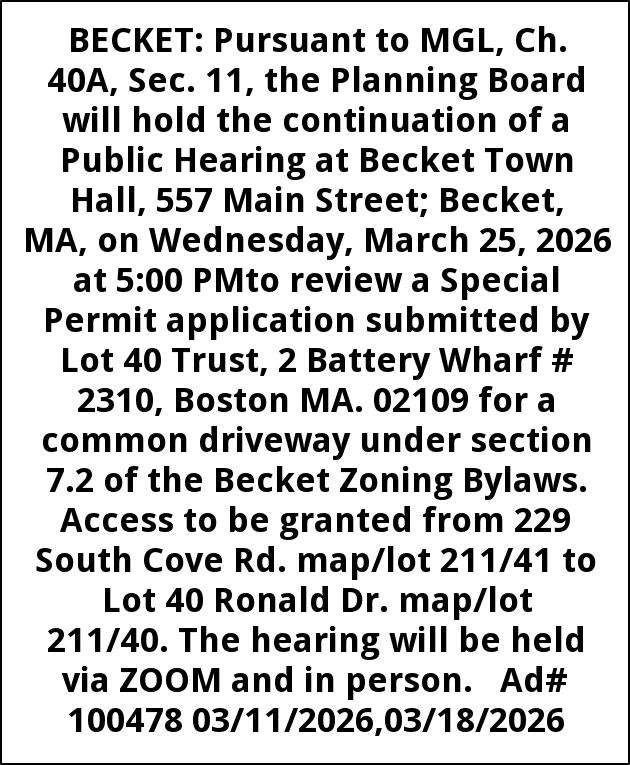 BECKET: Pursuant to MGL, Ch. 40A, Sec. 11, the Planning Board will hold the continuation of a Public Hearing at Becket Town Hall, 557 Main Street; Becket, MA, on Wednesday, March 25, 2026 at 5:00 PMto review a Special Permit application submitted by Lot 40 Trust, 2 Battery Wharf # 2310, Boston MA. 02109 for a common driveway under section 7.2 of the Becket Zoning Bylaws. Access to be granted from 229 South Cove Rd. map/lot 211/41 to Lot 40 Ronald Dr. map/lot 211/40. The hearing will be held via ZOOM and in person. Ad# 100478 03/11/2026,03/18/2026