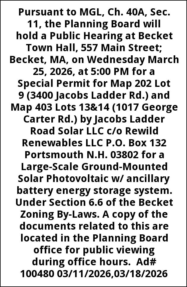 Pursuant to MGL, Ch. 40A, Sec. 11, the Planning Board will hold a Public Hearing at Becket Town Hall, 557 Main Street; Becket, MA, on Wednesday March 25, 2026, at 5:00 PM for a Special Permit for Map 202 Lot 9 (3400 Jacobs Ladder Rd.) and Map 403 Lots 13&14 (1017 George Carter Rd.) by Jacobs Ladder Road Solar LLC c/o Rewild Renewables LLC P.O. Box 132 Portsmouth N.H. 03802 for a Large-Scale Ground-Mounted Solar Photovoltaic w/ ancillary battery energy storage system. Under Section 6.6 of the Becket Zoning By-Laws. A copy of the documents related to this are located in the Planning Board office for public viewing during office hours. Ad# 100480 03/11/2026,03/18/2026