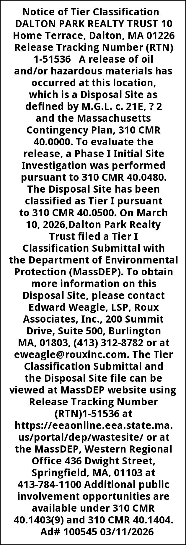 Notice of Tier Classification DALTON PARK REALTY TRUST 10 Home Terrace, Dalton, MA 01226 Release Tracking Number (RTN) 1-51536 A release of oil and/or hazardous materials has occurred at this location, which is a Disposal Site as defined by M.G.L. c. 21E, ? 2 and the Massachusetts Contingency Plan, 310 CMR 40.0000. To evaluate the release, a Phase I Initial Site Investigation was performed pursuant to 310 CMR 40.0480. The Disposal Site has been classified as Tier I pursuant to 310 CMR 40.0500. On March 10, 2026,Dalton Park Realty Trust filed a Tier I Classification Submittal with the Department of Environmental Protection (MassDEP). To obtain more information on this Disposal Site, please contact Edward Weagle, LSP, Roux Associates, Inc., 200 Summit Drive, Suite 500, Burlington MA, 01803, (413) 312-8782 or at eweagle@rouxinc.com. The Tier Classification Submittal and the Disposal Site file can be viewed at MassDEP website using Release Tracking Number (RTN)1-51536 at https://eeaonline.eea.state.ma.us/portal/dep/wastesite/ or at the MassDEP, Western Regional Office 436 Dwight Street, Springfield, MA, 01103 at 413-784-1100 Additional public involvement opportunities are available under 310 CMR 40.1403(9) and 310 CMR 40.1404. Ad# 100545 03/11/2026