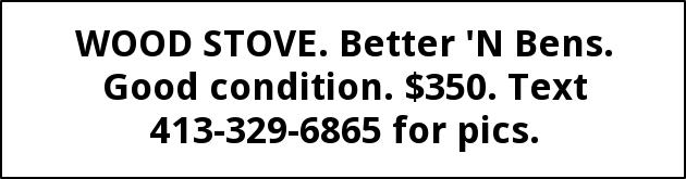 WOOD STOVE. Better 'N Bens. Good condition. $350. Text 413-329-6865 for pics.