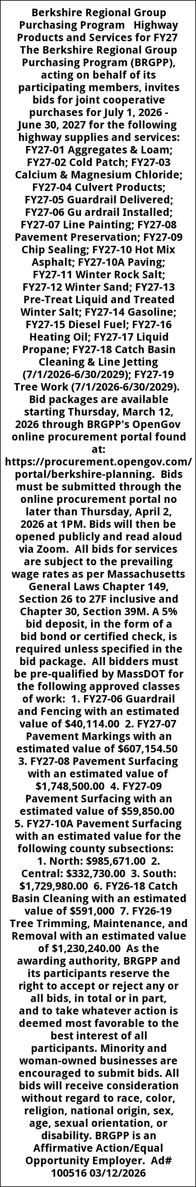 Berkshire Regional Group Purchasing Program Highway Products and Services for FY27 The Berkshire Regional Group Purchasing Program (BRGPP), acting on behalf of its participating members, invites bids for joint cooperative purchases for July 1, 2026 - June 30, 2027 for the following highway supplies and services: FY27-01 Aggregates & Loam; FY27-02 Cold Patch; FY27-03 Calcium & Magnesium Chloride; FY27-04 Culvert Products; FY27-05 Guardrail Delivered; FY27-06 Gu ardrail Installed; FY27-07 Line Painting; FY27-08 Pavement Preservation; FY27-09 Chip Sealing; FY27-10 Hot Mix Asphalt; FY27-10A Paving; FY27-11 Winter Rock Salt; FY27-12 Winter Sand; FY27-13 Pre-Treat Liquid and Treated Winter Salt; FY27-14 Gasoline; FY27-15 Diesel Fuel; FY27-16 Heating Oil; FY27-17 Liquid Propane; FY27-18 Catch Basin Cleaning & Line Jetting (7/1/2026-6/30/2029); FY27-19 Tree Work (7/1/2026-6/30/2029). Bid packages are available starting Thursday, March 12, 2026 through BRGPP's OpenGov online procurement portal found at: https://procurement.opengov.com/portal/berkshire-planning. Bids must be submitted through the online procurement portal no later than Thursday, April 2, 2026 at 1PM. Bids will then be opened publicly and read aloud via Zoom. All bids for services are subject to the prevailing wage rates as per Massachusetts General Laws Chapter 149, Section 26 to 27F inclusive and Chapter 30, Section 39M. A 5% bid deposit, in the form of a bid bond or certified check, is required unless specified in the bid package. All bidders must be pre-qualified by MassDOT for the following approved classes of work: 1. FY27-06 Guardrail and Fencing with an estimated value of $40,114.00 2. FY27-07 Pavement Markings with an estimated value of $607,154.50 3. FY27-08 Pavement Surfacing with an estimated value of $1,748,500.00 4. FY27-09 Pavement Surfacing with an estimated value of $59,850.00 5. FY27-10A Pavement Surfacing with an estimated value for the following county subsections: 1. North: $985,671.00 2. Central: $332,730.00 3. South: $1,729,980.00 6. FY26-18 Catch Basin Cleaning with an estimated value of $591,000 7. FY26-19 Tree Trimming, Maintenance, and Removal with an estimated value of $1,230,240.00 As the awarding authority, BRGPP and its participants reserve the right to accept or reject any or all bids, in total or in part, and to take whatever action is deemed most favorable to the best interest of all participants. Minority and woman-owned businesses are encouraged to submit bids. All bids will receive consideration without regard to race, color, religion, national origin, sex, age, sexual orientation, or disability. BRGPP is an Affirmative Action/Equal Opportunity Employer. Ad# 100516 03/12/2026