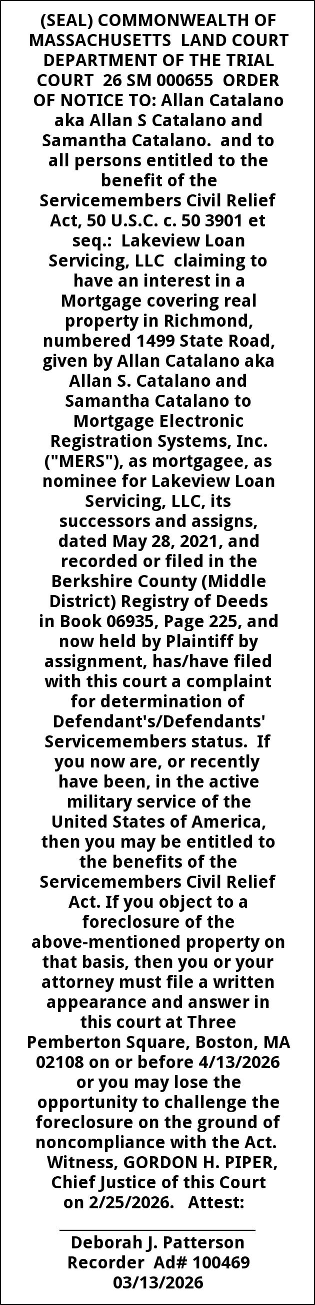 (SEAL) COMMONWEALTH OF MASSACHUSETTS LAND COURT DEPARTMENT OF THE TRIAL COURT 26 SM 000655 ORDER OF NOTICE TO: Allan Catalano aka Allan S Catalano and Samantha Catalano. and to all persons entitled to the benefit of the Servicemembers Civil Relief Act, 50 U.S.C. c. 50 3901 et seq.: Lakeview Loan Servicing, LLC claiming to have an interest in a Mortgage covering real property in Richmond, numbered 1499 State Road, given by Allan Catalano aka Allan S. Catalano and Samantha Catalano to Mortgage Electronic Registration Systems, Inc. ("MERS"), as mortgagee, as nominee for Lakeview Loan Servicing, LLC, its successors and assigns, dated May 28, 2021, and recorded or filed in the Berkshire County (Middle District) Registry of Deeds in Book 06935, Page 225, and now held by Plaintiff by assignment, has/have filed with this court a complaint for determination of Defendant's/Defendants' Servicemembers status. If you now are, or recently have been, in the active military service of the United States of America, then you may be entitled to the benefits of the Servicemembers Civil Relief Act. If you object to a foreclosure of the above-mentioned property on that basis, then you or your attorney must file a written appearance and answer in this court at Three Pemberton Square, Boston, MA 02108 on or before 4/13/2026 or you may lose the opportunity to challenge the foreclosure on the ground of noncompliance with the Act. Witness, GORDON H. PIPER, Chief Justice of this Court on 2/25/2026. Attest: ____________________________ Deborah J. Patterson Recorder Ad# 100469 03/13/2026