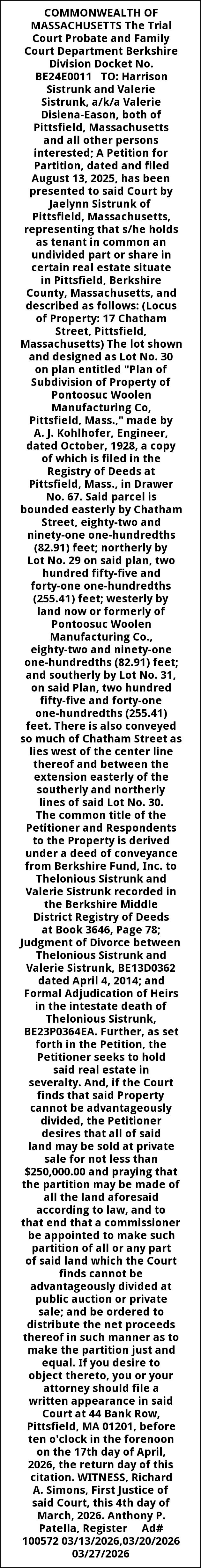 COMMONWEALTH OF MASSACHUSETTS The Trial Court Probate and Family Court Department Berkshire Division Docket No. BE24E0011 TO: Harrison Sistrunk and Valerie Sistrunk, a/k/a Valerie Disiena-Eason, both of Pittsfield, Massachusetts and all other persons interested; A Petition for Partition, dated and filed August 13, 2025, has been presented to said Court by Jaelynn Sistrunk of Pittsfield, Massachusetts, representing that s/he holds as tenant in common an undivided part or share in certain real estate situate in Pittsfield, Berkshire County, Massachusetts, and described as follows: (Locus of Property: 17 Chatham Street, Pittsfield, Massachusetts) The lot shown and designed as Lot No. 30 on plan entitled "Plan of Subdivision of Property of Pontoosuc Woolen Manufacturing Co, Pittsfield, Mass.," made by A. J. Kohlhofer, Engineer, dated October, 1928, a copy of which is filed in the Registry of Deeds at Pittsfield, Mass., in Drawer No. 67. Said parcel is bounded easterly by Chatham Street, eighty-two and ninety-one one-hundredths (82.91) feet; northerly by Lot No. 29 on said plan, two hundred fifty-five and forty-one one-hundredths (255.41) feet; westerly by land now or formerly of Pontoosuc Woolen Manufacturing Co., eighty-two and ninety-one one-hundredths (82.91) feet; and southerly by Lot No. 31, on said Plan, two hundred fifty-five and forty-one one-hundredths (255.41) feet. There is also conveyed so much of Chatham Street as lies west of the center line thereof and between the extension easterly of the southerly and northerly lines of said Lot No. 30. The common title of the Petitioner and Respondents to the Property is derived under a deed of conveyance from Berkshire Fund, Inc. to Thelonious Sistrunk and Valerie Sistrunk recorded in the Berkshire Middle District Registry of Deeds at Book 3646, Page 78; Judgment of Divorce between Thelonious Sistrunk and Valerie Sistrunk, BE13D0362 dated April 4, 2014; and Formal Adjudication of Heirs in the intestate death of Thelonious Sistrunk, BE23P0364EA. Further, as set forth in the Petition, the Petitioner seeks to hold said real estate in severalty. And, if the Court finds that said Property cannot be advantageously divided, the Petitioner desires that all of said land may be sold at private sale for not less than $250,000.00 and praying that the partition may be made of all the land aforesaid according to law, and to that end that a commissioner be appointed to make such partition of all or any part of said land which the Court finds cannot be advantageously divided at public auction or private sale; and be ordered to distribute the net proceeds thereof in such manner as to make the partition just and equal. If you desire to object thereto, you or your attorney should file a written appearance in said Court at 44 Bank Row, Pittsfield, MA 01201, before ten o'clock in the forenoon on the 17th day of April, 2026, the return day of this citation. WITNESS, Richard A. Simons, First Justice of said Court, this 4th day of March, 2026. Anthony P. Patella, Register Ad# 100572 03/13/2026,03/20/2026 03/27/2026
