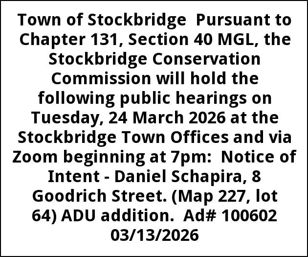 Town of Stockbridge Pursuant to Chapter 131, Section 40 MGL, the Stockbridge Conservation Commission will hold the following public hearings on Tuesday, 24 March 2026 at the Stockbridge Town Offices and via Zoom beginning at 7pm: Notice of Intent - Daniel Schapira, 8 Goodrich Street. (Map 227, lot 64) ADU addition. Ad# 100602 03/13/2026