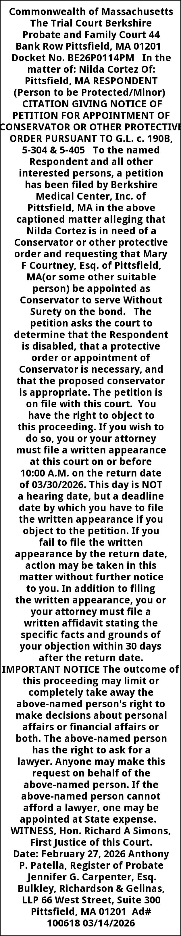 Commonwealth of Massachusetts The Trial Court Berkshire Probate and Family Court 44 Bank Row Pittsfield, MA 01201 Docket No. BE26P0114PM In the matter of: Nilda Cortez Of: Pittsfield, MA RESPONDENT (Person to be Protected/Minor) CITATION GIVING NOTICE OF PETITION FOR APPOINTMENT OF CONSERVATOR OR OTHER PROTECTIVE ORDER PURSUANT TO G.L. c. 190B, 5-304 & 5-405 To the named Respondent and all other interested persons, a petition has been filed by Berkshire Medical Center, Inc. of Pittsfield, MA in the above captioned matter alleging that Nilda Cortez is in need of a Conservator or other protective order and requesting that Mary F Courtney, Esq. of Pittsfield, MA(or some other suitable person) be appointed as Conservator to serve Without Surety on the bond. The petition asks the court to determine that the Respondent is disabled, that a protective order or appointment of Conservator is necessary, and that the proposed conservator is appropriate. The petition is on file with this court. You have the right to object to this proceeding. If you wish to do so, you or your attorney must file a written appearance at this court on or before 10:00 A.M. on the return date of 03/30/2026. This day is NOT a hearing date, but a deadline date by which you have to file the written appearance if you object to the petition. If you fail to file the written appearance by the return date, action may be taken in this matter without further notice to you. In addition to filing the written appearance, you or your attorney must file a written affidavit stating the specific facts and grounds of your objection within 30 days after the return date. IMPORTANT NOTICE The outcome of this proceeding may limit or completely take away the above-named person's right to make decisions about personal affairs or financial affairs or both. The above-named person has the right to ask for a lawyer. Anyone may make this request on behalf of the above-named person. If the above-named person cannot afford a lawyer, one may be appointed at State expense. WITNESS, Hon. Richard A Simons, First Justice of this Court. Date: February 27, 2026 Anthony P. Patella, Register of Probate Jennifer G. Carpenter, Esq. Bulkley, Richardson & Gelinas, LLP 66 West Street, Suite 300 Pittsfield, MA 01201 Ad# 100618 03/14/2026