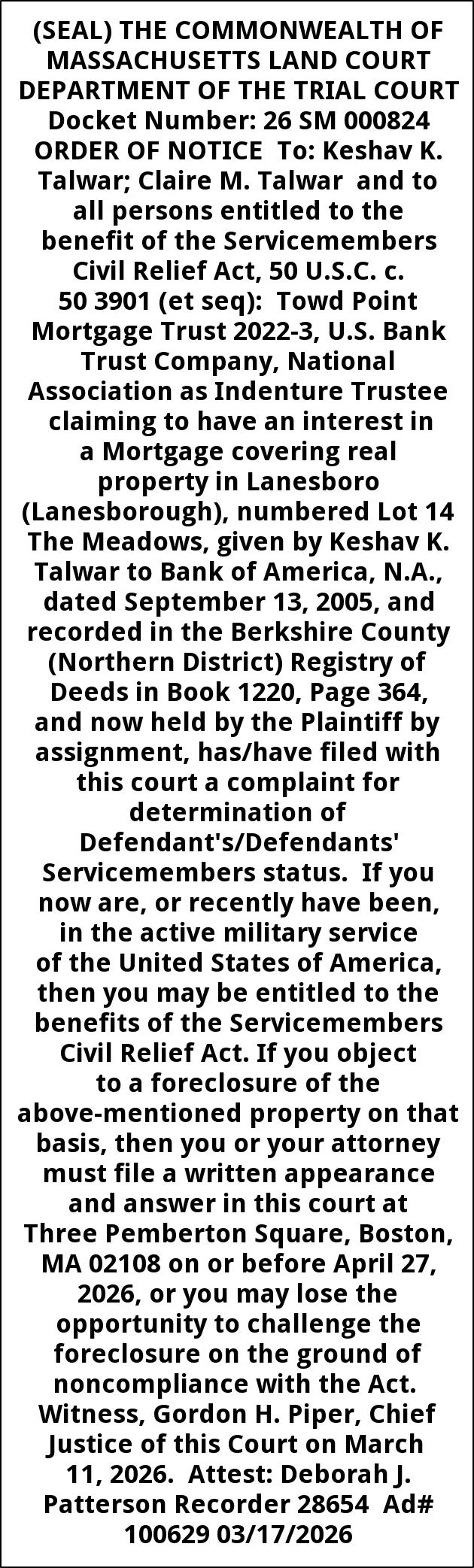 (SEAL) THE COMMONWEALTH OF MASSACHUSETTS LAND COURT DEPARTMENT OF THE TRIAL COURT Docket Number: 26 SM 000824 ORDER OF NOTICE To: Keshav K. Talwar; Claire M. Talwar and to all persons entitled to the benefit of the Servicemembers Civil Relief Act, 50 U.S.C. c. 50 3901 (et seq): Towd Point Mortgage Trust 2022-3, U.S. Bank Trust Company, National Association as Indenture Trustee claiming to have an interest in a Mortgage covering real property in Lanesboro (Lanesborough), numbered Lot 14 The Meadows, given by Keshav K. Talwar to Bank of America, N.A., dated September 13, 2005, and recorded in the Berkshire County (Northern District) Registry of Deeds in Book 1220, Page 364, and now held by the Plaintiff by assignment, has/have filed with this court a complaint for determination of Defendant's/Defendants' Servicemembers status. If you now are, or recently have been, in the active military service of the United States of America, then you may be entitled to the benefits of the Servicemembers Civil Relief Act. If you object to a foreclosure of the above-mentioned property on that basis, then you or your attorney must file a written appearance and answer in this court at Three Pemberton Square, Boston, MA 02108 on or before April 27, 2026, or you may lose the opportunity to challenge the foreclosure on the ground of noncompliance with the Act. Witness, Gordon H. Piper, Chief Justice of this Court on March 11, 2026. Attest: Deborah J. Patterson Recorder 28654 Ad# 100629 03/17/2026