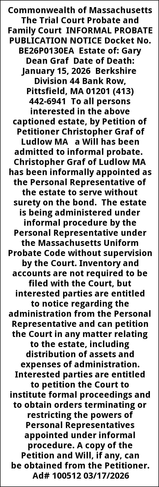 Commonwealth of Massachusetts The Trial Court Probate and Family Court INFORMAL PROBATE PUBLICATION NOTICE Docket No. BE26P0130EA Estate of: Gary Dean Graf Date of Death: January 15, 2026 Berkshire Division 44 Bank Row, Pittsfield, MA 01201 (413) 442-6941 To all persons interested in the above captioned estate, by Petition of Petitioner Christopher Graf of Ludlow MA a Will has been admitted to informal probate. Christopher Graf of Ludlow MA has been informally appointed as the Personal Representative of the estate to serve without surety on the bond. The estate is being administered under informal procedure by the Personal Representative under the Massachusetts Uniform Probate Code without supervision by the Court. Inventory and accounts are not required to be filed with the Court, but interested parties are entitled to notice regarding the administration from the Personal Representative and can petition the Court in any matter relating to the estate, including distribution of assets and expenses of administration. Interested parties are entitled to petition the Court to institute formal proceedings and to obtain orders terminating or restricting the powers of Personal Representatives appointed under informal procedure. A copy of the Petition and Will, if any, can be obtained from the Petitioner. Ad# 100512 03/17/2026