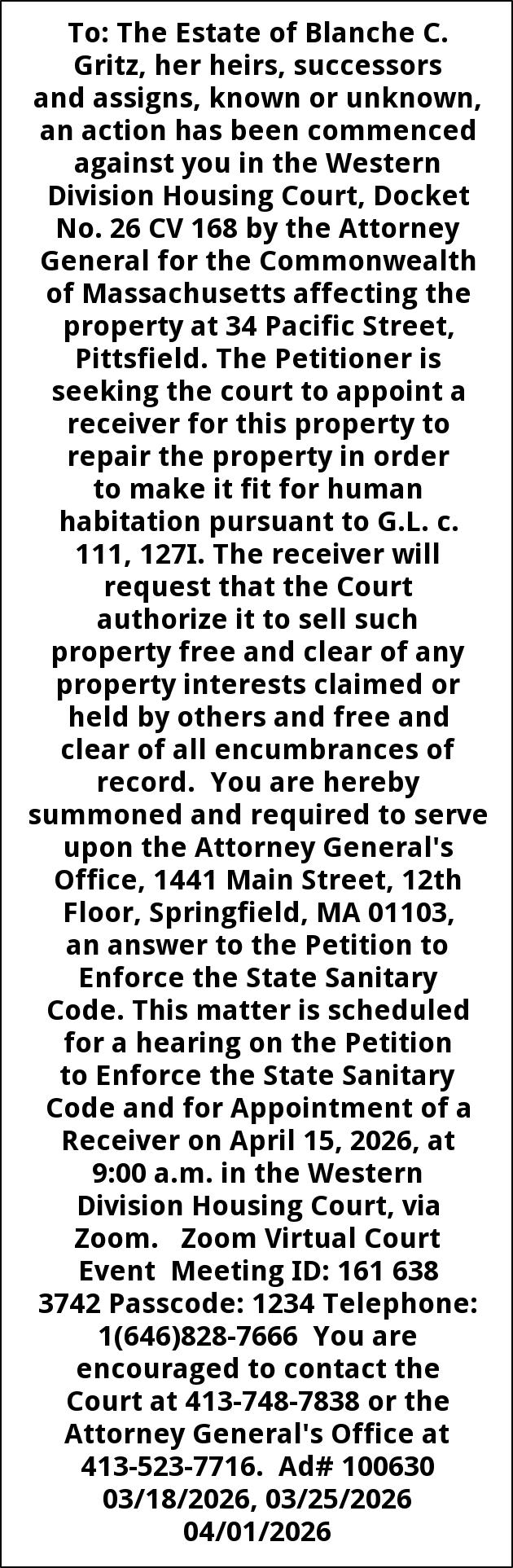 To: The Estate of Blanche C. Gritz, her heirs, successors and assigns, known or unknown, an action has been commenced against you in the Western Division Housing Court, Docket No. 26 CV 168 by the Attorney General for the Commonwealth of Massachusetts affecting the property at 34 Pacific Street, Pittsfield. The Petitioner is seeking the court to appoint a receiver for this property to repair the property in order to make it fit for human habitation pursuant to G.L. c. 111, 127I. The receiver will request that the Court authorize it to sell such property free and clear of any property interests claimed or held by others and free and clear of all encumbrances of record. You are hereby summoned and required to serve upon the Attorney General's Office, 1441 Main Street, 12th Floor, Springfield, MA 01103, an answer to the Petition to Enforce the State Sanitary Code. This matter is scheduled for a hearing on the Petition to Enforce the State Sanitary Code and for Appointment of a Receiver on April 15, 2026, at 9:00 a.m. in the Western Division Housing Court, via Zoom. Zoom Virtual Court Event Meeting ID: 161 638 3742 Passcode: 1234 Telephone: 1(646)828-7666 You are encouraged to contact the Court at 413-748-7838 or the Attorney General's Office at 413-523-7716. Ad# 100630 03/18/2026, 03/25/2026 04/01/2026