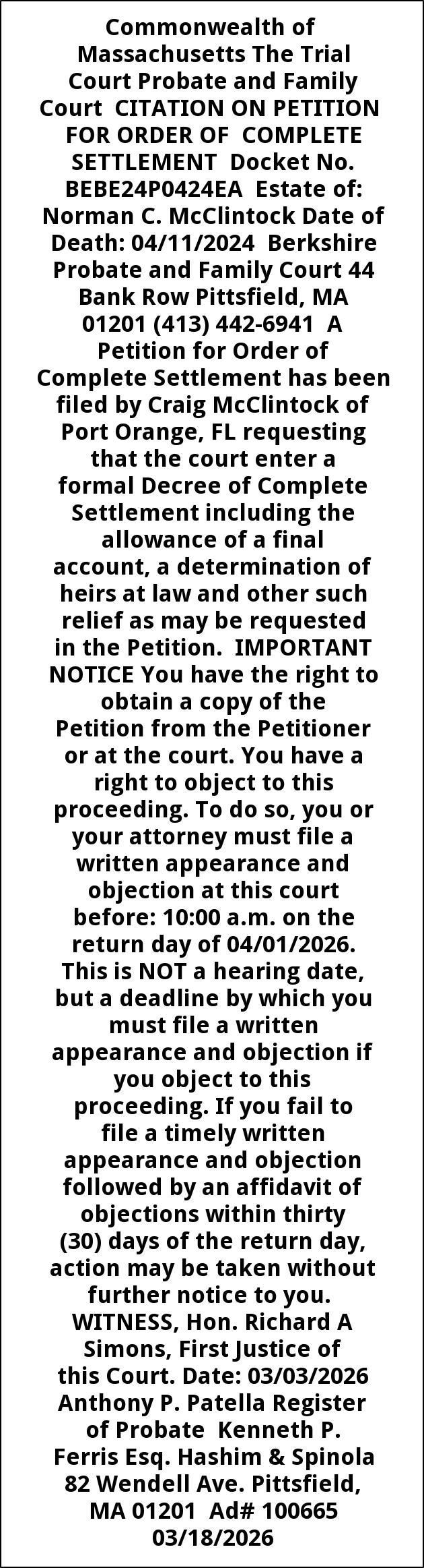 Commonwealth of Massachusetts The Trial Court Probate and Family Court CITATION ON PETITION FOR ORDER OF COMPLETE SETTLEMENT Docket No. BEBE24P0424EA Estate of: Norman C. McClintock Date of Death: 04/11/2024 Berkshire Probate and Family Court 44 Bank Row Pittsfield, MA 01201 (413) 442-6941 A Petition for Order of Complete Settlement has been filed by Craig McClintock of Port Orange, FL requesting that the court enter a formal Decree of Complete Settlement including the allowance of a final account, a determination of heirs at law and other such relief as may be requested in the Petition. IMPORTANT NOTICE You have the right to obtain a copy of the Petition from the Petitioner or at the court. You have a right to object to this proceeding. To do so, you or your attorney must file a written appearance and objection at this court before: 10:00 a.m. on the return day of 04/01/2026. This is NOT a hearing date, but a deadline by which you must file a written appearance and objection if you object to this proceeding. If you fail to file a timely written appearance and objection followed by an affidavit of objections within thirty (30) days of the return day, action may be taken without further notice to you. WITNESS, Hon. Richard A Simons, First Justice of this Court. Date: 03/03/2026 Anthony P. Patella Register of Probate Kenneth P. Ferris Esq. Hashim & Spinola 82 Wendell Ave. Pittsfield, MA 01201 Ad# 100665 03/18/2026