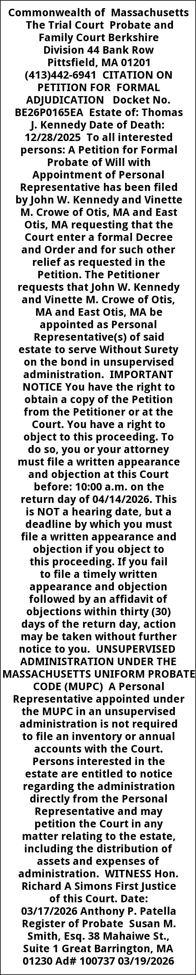 Commonwealth of Massachusetts The Trial Court Probate and Family Court Berkshire Division 44 Bank Row Pittsfield, MA 01201 (413)442-6941 CITATION ON PETITION FOR FORMAL ADJUDICATION Docket No. BE26P0165EA Estate of: Thomas J. Kennedy Date of Death: 12/28/2025 To all interested persons: A Petition for Formal Probate of Will with Appointment of Personal Representative has been filed by John W. Kennedy and Vinette M. Crowe of Otis, MA and East Otis, MA requesting that the Court enter a formal Decree and Order and for such other relief as requested in the Petition. The Petitioner requests that John W. Kennedy and Vinette M. Crowe of Otis, MA and East Otis, MA be appointed as Personal Representative(s) of said estate to serve Without Surety on the bond in unsupervised administration. IMPORTANT NOTICE You have the right to obtain a copy of the Petition from the Petitioner or at the Court. You have a right to object to this proceeding. To do so, you or your attorney must file a written appearance and objection at this Court before: 10:00 a.m. on the return day of 04/14/2026. This is NOT a hearing date, but a deadline by which you must file a written appearance and objection if you object to this proceeding. If you fail to file a timely written appearance and objection followed by an affidavit of objections within thirty (30) days of the return day, action may be taken without further notice to you. UNSUPERVISED ADMINISTRATION UNDER THE MASSACHUSETTS UNIFORM PROBATE CODE (MUPC) A Personal Representative appointed under the MUPC in an unsupervised administration is not required to file an inventory or annual accounts with the Court. Persons interested in the estate are entitled to notice regarding the administration directly from the Personal Representative and may petition the Court in any matter relating to the estate, including the distribution of assets and expenses of administration. WITNESS Hon. Richard A Simons First Justice of this Court. Date: 03/17/2026 Anthony P. Patella Register of Probate Susan M. Smith, Esq. 38 Mahaiwe St., Suite 1 Great Barrington, MA 01230 Ad# 100737 03/19/2026