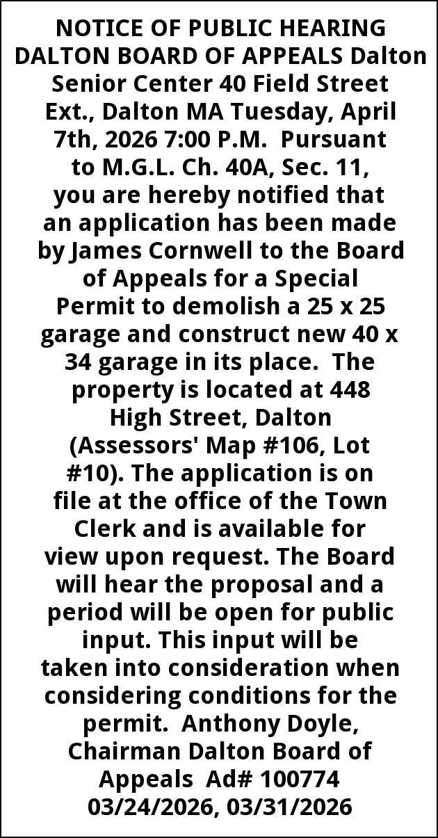 NOTICE OF PUBLIC HEARING DALTON BOARD OF APPEALS Dalton Senior Center 40 Field Street Ext., Dalton MA Tuesday, April 7th, 2026 7:00 P.M. Pursuant to M.G.L. Ch. 40A, Sec. 11, you are hereby notified that an application has been made by James Cornwell to the Board of Appeals for a Special Permit to demolish a 25 x 25 garage and construct new 40 x 34 garage in its place. The property is located at 448 High Street, Dalton (Assessors' Map #106, Lot #10). The application is on file at the office of the Town Clerk and is available for view upon request. The Board will hear the proposal and a period will be open for public input. This input will be taken into consideration when considering conditions for the permit. Anthony Doyle, Chairman Dalton Board of Appeals Ad# 100774 03/24/2026, 03/31/2026