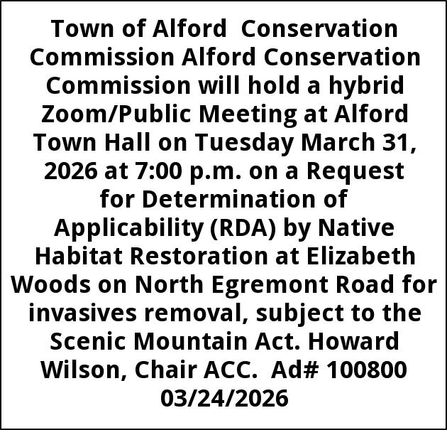 Town of Alford Conservation Commission Alford Conservation Commission will hold a hybrid Zoom/Public Meeting at Alford Town Hall on Tuesday March 31, 2026 at 7:00 p.m. on a Request for Determination of Applicability (RDA) by Native Habitat Restoration at Elizabeth Woods on North Egremont Road for invasives removal, subject to the Scenic Mountain Act. Howard Wilson, Chair ACC. Ad# 100800 03/24/2026
