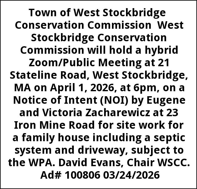 Town of West Stockbridge Conservation Commission West Stockbridge Conservation Commission will hold a hybrid Zoom/Public Meeting at 21 Stateline Road, West Stockbridge, MA on April 1, 2026, at 6pm, on a Notice of Intent (NOI) by Eugene and Victoria Zacharewicz at 23 Iron Mine Road for site work for a family house including a septic system and driveway, subject to the WPA. David Evans, Chair WSCC. Ad# 100806 03/24/2026