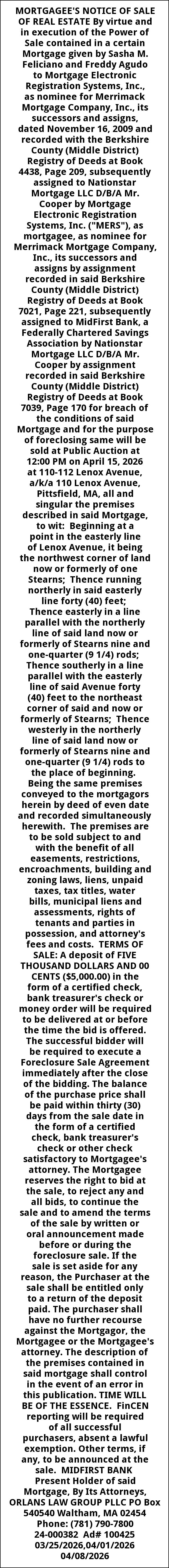 MORTGAGEE'S NOTICE OF SALE OF REAL ESTATE By virtue and in execution of the Power of Sale contained in a certain Mortgage given by Sasha M. Feliciano and Freddy Agudo to Mortgage Electronic Registration Systems, Inc., as nominee for Merrimack Mortgage Company, Inc., its successors and assigns, dated November 16, 2009 and recorded with the Berkshire County (Middle District) Registry of Deeds at Book 4438, Page 209, subsequently assigned to Nationstar Mortgage LLC D/B/A Mr. Cooper by Mortgage Electronic Registration Systems, Inc. ("MERS"), as mortgagee, as nominee for Merrimack Mortgage Company, Inc., its successors and assigns by assignment recorded in said Berkshire County (Middle District) Registry of Deeds at Book 7021, Page 221, subsequently assigned to MidFirst Bank, a Federally Chartered Savings Association by Nationstar Mortgage LLC D/B/A Mr. Cooper by assignment recorded in said Berkshire County (Middle District) Registry of Deeds at Book 7039, Page 170 for breach of the conditions of said Mortgage and for the purpose of foreclosing same will be sold at Public Auction at 12:00 PM on April 15, 2026 at 110-112 Lenox Avenue, a/k/a 110 Lenox Avenue, Pittsfield, MA, all and singular the premises described in said Mortgage, to wit: Beginning at a point in the easterly line of Lenox Avenue, it being the northwest corner of land now or formerly of one Stearns; Thence running northerly in said easterly line forty (40) feet; Thence easterly in a line parallel with the northerly line of said land now or formerly of Stearns nine and one-quarter (9 1/4) rods; Thence southerly in a line parallel with the easterly line of said Avenue forty (40) feet to the northeast corner of said and now or formerly of Stearns; Thence westerly in the northerly line of said land now or formerly of Stearns nine and one-quarter (9 1/4) rods to the place of beginning. Being the same premises conveyed to the mortgagors herein by deed of even date and recorded simultaneously herewith. The premises are to be sold subject to and with the benefit of all easements, restrictions, encroachments, building and zoning laws, liens, unpaid taxes, tax titles, water bills, municipal liens and assessments, rights of tenants and parties in possession, and attorney's fees and costs. TERMS OF SALE: A deposit of FIVE THOUSAND DOLLARS AND 00 CENTS ($5,000.00) in the form of a certified check, bank treasurer's check or money order will be required to be delivered at or before the time the bid is offered. The successful bidder will be required to execute a Foreclosure Sale Agreement immediately after the close of the bidding. The balance of the purchase price shall be paid within thirty (30) days from the sale date in the form of a certified check, bank treasurer's check or other check satisfactory to Mortgagee's attorney. The Mortgagee reserves the right to bid at the sale, to reject any and all bids, to continue the sale and to amend the terms of the sale by written or oral announcement made before or during the foreclosure sale. If the sale is set aside for any reason, the Purchaser at the sale shall be entitled only to a return of the deposit paid. The purchaser shall have no further recourse against the Mortgagor, the Mortgagee or the Mortgagee's attorney. The description of the premises contained in said mortgage shall control in the event of an error in this publication. TIME WILL BE OF THE ESSENCE. FinCEN reporting will be required of all successful purchasers, absent a lawful exemption. Other terms, if any, to be announced at the sale. MIDFIRST BANK Present Holder of said Mortgage, By Its Attorneys, ORLANS LAW GROUP PLLC PO Box 540540 Waltham, MA 02454 Phone: (781) 790-7800 24-000382 Ad# 100425 03/25/2026,04/01/2026 04/08/2026