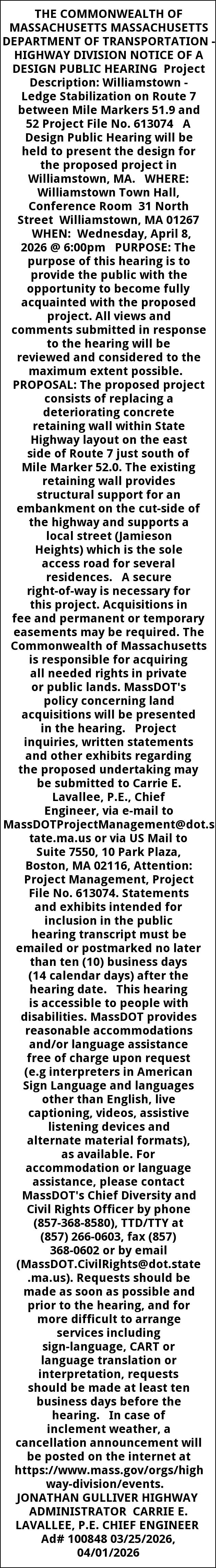 THE COMMONWEALTH OF MASSACHUSETTS MASSACHUSETTS DEPARTMENT OF TRANSPORTATION - HIGHWAY DIVISION NOTICE OF A DESIGN PUBLIC HEARING Project Description: Williamstown - Ledge Stabilization on Route 7 between Mile Markers 51.9 and 52 Project File No. 613074 A Design Public Hearing will be held to present the design for the proposed project in Williamstown, MA. WHERE: Williamstown Town Hall, Conference Room 31 North Street Williamstown, MA 01267 WHEN: Wednesday, April 8, 2026 @ 6:00pm PURPOSE: The purpose of this hearing is to provide the public with the opportunity to become fully acquainted with the proposed project. All views and comments submitted in response to the hearing will be reviewed and considered to the maximum extent possible. PROPOSAL: The proposed project consists of replacing a deteriorating concrete retaining wall within State Highway layout on the east side of Route 7 just south of Mile Marker 52.0. The existing retaining wall provides structural support for an embankment on the cut-side of the highway and supports a local street (Jamieson Heights) which is the sole access road for several residences. A secure right-of-way is necessary for this project. Acquisitions in fee and permanent or temporary easements may be required. The Commonwealth of Massachusetts is responsible for acquiring all needed rights in private or public lands. MassDOT's policy concerning land acquisitions will be presented in the hearing. Project inquiries, written statements and other exhibits regarding the proposed undertaking may be submitted to Carrie E. Lavallee, P.E., Chief Engineer, via e-mail to MassDOTProjectManagement@dot.state.ma.us or via US Mail to Suite 7550, 10 Park Plaza, Boston, MA 02116, Attention: Project Management, Project File No. 613074. Statements and exhibits intended for inclusion in the public hearing transcript must be emailed or postmarked no later than ten (10) business days (14 calendar days) after the hearing date. This hearing is accessible to people with disabilities. MassDOT provides reasonable accommodations and/or language assistance free of charge upon request (e.g interpreters in American Sign Language and languages other than English, live captioning, videos, assistive listening devices and alternate material formats), as available. For accommodation or language assistance, please contact MassDOT's Chief Diversity and Civil Rights Officer by phone (857-368-8580), TTD/TTY at (857) 266-0603, fax (857) 368-0602 or by email (MassDOT.CivilRights@dot.state.ma.us). Requests should be made as soon as possible and prior to the hearing, and for more difficult to arrange services including sign-language, CART or language translation or interpretation, requests should be made at least ten business days before the hearing. In case of inclement weather, a cancellation announcement will be posted on the internet at https://www.mass.gov/orgs/highway-division/events. JONATHAN GULLIVER HIGHWAY ADMINISTRATOR CARRIE E. LAVALLEE, P.E. CHIEF ENGINEER Ad# 100848 03/25/2026, 04/01/2026