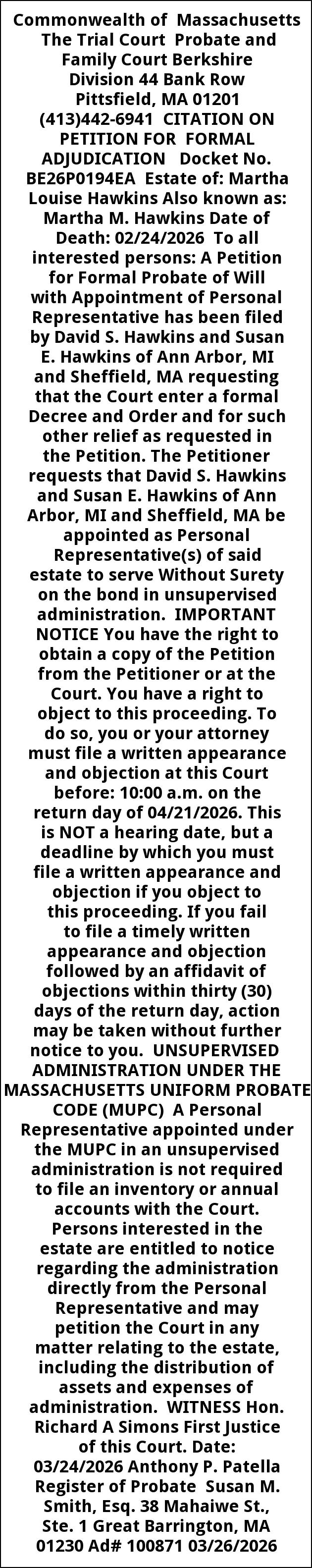 Commonwealth of Massachusetts The Trial Court Probate and Family Court Berkshire Division 44 Bank Row Pittsfield, MA 01201 (413)442-6941 CITATION ON PETITION FOR FORMAL ADJUDICATION Docket No. BE26P0194EA Estate of: Martha Louise Hawkins Also known as: Martha M. Hawkins Date of Death: 02/24/2026 To all interested persons: A Petition for Formal Probate of Will with Appointment of Personal Representative has been filed by David S. Hawkins and Susan E. Hawkins of Ann Arbor, MI and Sheffield, MA requesting that the Court enter a formal Decree and Order and for such other relief as requested in the Petition. The Petitioner requests that David S. Hawkins and Susan E. Hawkins of Ann Arbor, MI and Sheffield, MA be appointed as Personal Representative(s) of said estate to serve Without Surety on the bond in unsupervised administration. IMPORTANT NOTICE You have the right to obtain a copy of the Petition from the Petitioner or at the Court. You have a right to object to this proceeding. To do so, you or your attorney must file a written appearance and objection at this Court before: 10:00 a.m. on the return day of 04/21/2026. This is NOT a hearing date, but a deadline by which you must file a written appearance and objection if you object to this proceeding. If you fail to file a timely written appearance and objection followed by an affidavit of objections within thirty (30) days of the return day, action may be taken without further notice to you. UNSUPERVISED ADMINISTRATION UNDER THE MASSACHUSETTS UNIFORM PROBATE CODE (MUPC) A Personal Representative appointed under the MUPC in an unsupervised administration is not required to file an inventory or annual accounts with the Court. Persons interested in the estate are entitled to notice regarding the administration directly from the Personal Representative and may petition the Court in any matter relating to the estate, including the distribution of assets and expenses of administration. WITNESS Hon. Richard A Simons First Justice of this Court. Date: 03/24/2026 Anthony P. Patella Register of Probate Susan M. Smith, Esq. 38 Mahaiwe St., Ste. 1 Great Barrington, MA 01230 Ad# 100871 03/26/2026