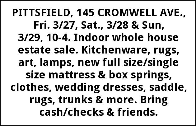 PITTSFIELD, 145 CROMWELL AVE., Fri. 3/27, Sat., 3/28 & Sun, 3/29, 10-4. Indoor whole house estate sale. Kitchenware, rugs, art, lamps, new full size/single size mattress & box springs, clothes, wedding dresses, saddle, rugs, trunks & more. Bring cash/checks & friends.
