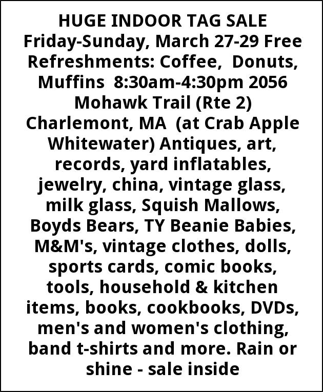 HUGE INDOOR TAG SALE Friday-Sunday, March 27-29 Free Refreshments: Coffee, Donuts, Muffins 8:30am-4:30pm 2056 Mohawk Trail (Rte 2) Charlemont, MA (at Crab Apple Whitewater) Antiques, art, records, yard inflatables, jewelry, china, vintage glass, milk glass, Squish Mallows, Boyds Bears, TY Beanie Babies, M&M's, vintage clothes, dolls, sports cards, comic books, tools, household & kitchen items, books, cookbooks, DVDs, men's and women's clothing, band t-shirts and more. Rain or shine - sale inside