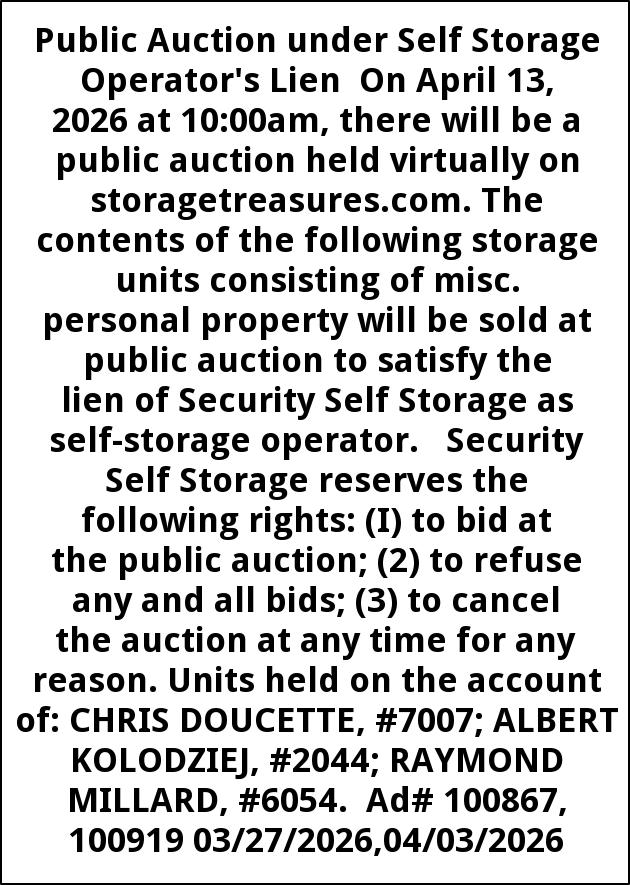 Public Auction under Self Storage Operator's Lien On April 13, 2026 at 10:00am, there will be a public auction held virtually on storagetreasures.com. The contents of the following storage units consisting of misc. personal property will be sold at public auction to satisfy the lien of Security Self Storage as self-storage operator. Security Self Storage reserves the following rights: (I) to bid at the public auction; (2) to refuse any and all bids; (3) to cancel the auction at any time for any reason. Units held on the account of: CHRIS DOUCETTE, #7007; ALBERT KOLODZIEJ, #2044; RAYMOND MILLARD, #6054. Ad# 100867, 100919 03/27/2026,04/03/2026