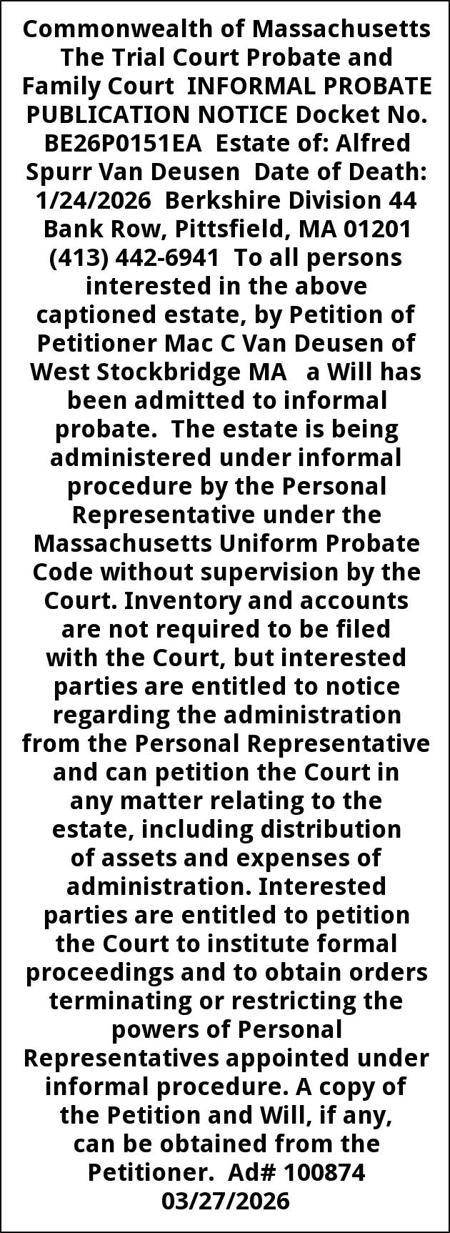 Commonwealth of Massachusetts The Trial Court Probate and Family Court INFORMAL PROBATE PUBLICATION NOTICE Docket No. BE26P0151EA Estate of: Alfred Spurr Van Deusen Date of Death: 1/24/2026 Berkshire Division 44 Bank Row, Pittsfield, MA 01201 (413) 442-6941 To all persons interested in the above captioned estate, by Petition of Petitioner Mac C Van Deusen of West Stockbridge MA a Will has been admitted to informal probate. The estate is being administered under informal procedure by the Personal Representative under the Massachusetts Uniform Probate Code without supervision by the Court. Inventory and accounts are not required to be filed with the Court, but interested parties are entitled to notice regarding the administration from the Personal Representative and can petition the Court in any matter relating to the estate, including distribution of assets and expenses of administration. Interested parties are entitled to petition the Court to institute formal proceedings and to obtain orders terminating or restricting the powers of Personal Representatives appointed under informal procedure. A copy of the Petition and Will, if any, can be obtained from the Petitioner. Ad# 100874 03/27/2026