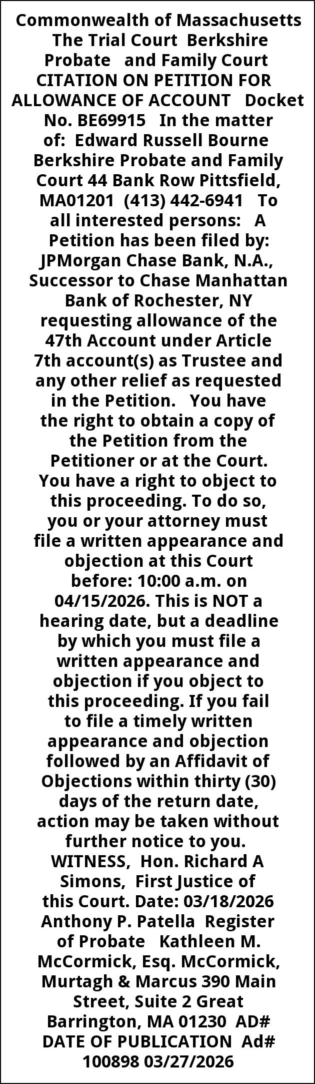 Commonwealth of Massachusetts The Trial Court Berkshire Probate and Family Court CITATION ON PETITION FOR ALLOWANCE OF ACCOUNT Docket No. BE69915 In the matter of: Edward Russell Bourne Berkshire Probate and Family Court 44 Bank Row Pittsfield, MA01201 (413) 442-6941 To all interested persons: A Petition has been filed by: JPMorgan Chase Bank, N.A., Successor to Chase Manhattan Bank of Rochester, NY requesting allowance of the 47th Account under Article 7th account(s) as Trustee and any other relief as requested in the Petition. You have the right to obtain a copy of the Petition from the Petitioner or at the Court. You have a right to object to this proceeding. To do so, you or your attorney must file a written appearance and objection at this Court before: 10:00 a.m. on 04/15/2026. This is NOT a hearing date, but a deadline by which you must file a written appearance and objection if you object to this proceeding. If you fail to file a timely written appearance and objection followed by an Affidavit of Objections within thirty (30) days of the return date, action may be taken without further notice to you. WITNESS, Hon. Richard A Simons, First Justice of this Court. Date: 03/18/2026 Anthony P. Patella Register of Probate Kathleen M. McCormick, Esq. McCormick, Murtagh & Marcus 390 Main Street, Suite 2 Great Barrington, MA 01230 AD# DATE OF PUBLICATION Ad# 100898 03/27/2026