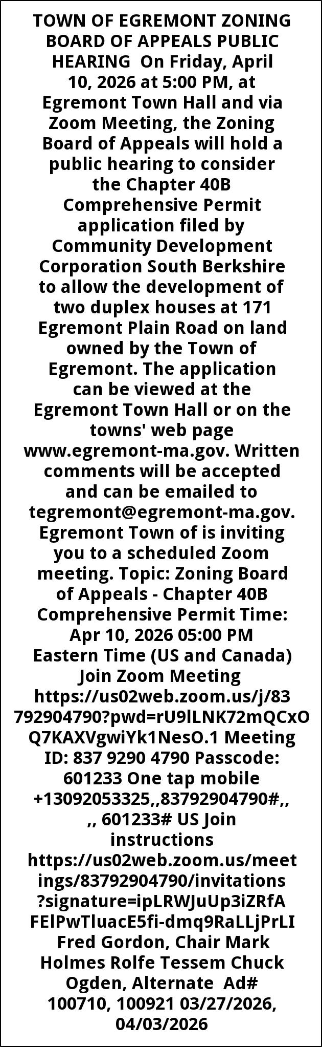 TOWN OF EGREMONT ZONING BOARD OF APPEALS PUBLIC HEARING On Friday, April 10, 2026 at 5:00 PM, at Egremont Town Hall and via Zoom Meeting, the Zoning Board of Appeals will hold a public hearing to consider the Chapter 40B Comprehensive Permit application filed by Community Development Corporation South Berkshire to allow the development of two duplex houses at 171 Egremont Plain Road on land owned by the Town of Egremont. The application can be viewed at the Egremont Town Hall or on the towns' web page www.egremont-ma.gov. Written comments will be accepted and can be emailed to tegremont@egremont-ma.gov. Egremont Town of is inviting you to a scheduled Zoom meeting. Topic: Zoning Board of Appeals - Chapter 40B Comprehensive Permit Time: Apr 10, 2026 05:00 PM Eastern Time (US and Canada) Join Zoom Meeting https://us02web.zoom.us/j/83792904790?pwd=rU9lLNK72mQCxOQ7KAXVgwiYk1NesO.1 Meeting ID: 837 9290 4790 Passcode: 601233 One tap mobile +13092053325,,83792904790#,,,, 601233# US Join instructions https://us02web.zoom.us/meetings/83792904790/invitations?signature=ipLRWJuUp3iZRfA FElPwTluacE5fi-dmq9RaLLjPrLI Fred Gordon, Chair Mark Holmes Rolfe Tessem Chuck Ogden, Alternate Ad# 100710, 100921 03/27/2026, 04/03/2026