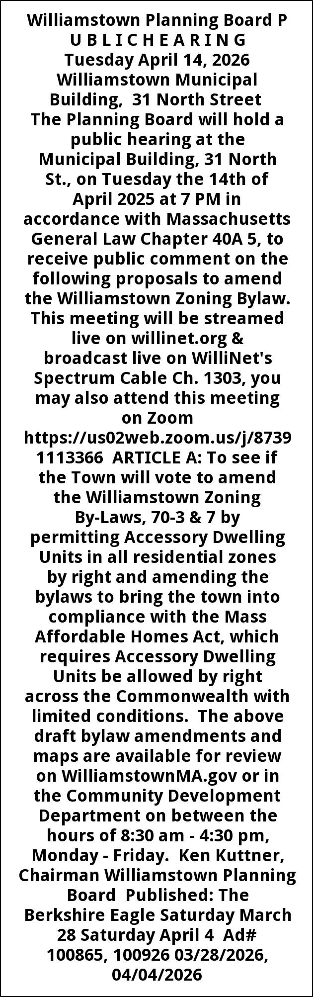 Williamstown Planning Board P U B L I C H E A R I N G Tuesday April 14, 2026 Williamstown Municipal Building, 31 North Street The Planning Board will hold a public hearing at the Municipal Building, 31 North St., on Tuesday the 14th of April 2025 at 7 PM in accordance with Massachusetts General Law Chapter 40A 5, to receive public comment on the following proposals to amend the Williamstown Zoning Bylaw. This meeting will be streamed live on willinet.org & broadcast live on WilliNet's Spectrum Cable Ch. 1303, you may also attend this meeting on Zoom https://us02web.zoom.us/j/87391113366 ARTICLE A: To see if the Town will vote to amend the Williamstown Zoning By-Laws, 70-3 & 7 by permitting Accessory Dwelling Units in all residential zones by right and amending the bylaws to bring the town into compliance with the Mass Affordable Homes Act, which requires Accessory Dwelling Units be allowed by right across the Commonwealth with limited conditions. The above draft bylaw amendments and maps are available for review on WilliamstownMA.gov or in the Community Development Department on between the hours of 8:30 am - 4:30 pm, Monday - Friday. Ken Kuttner, Chairman Williamstown Planning Board Published: The Berkshire Eagle Saturday March 28 Saturday April 4 Ad# 100865, 100926 03/28/2026, 04/04/2026