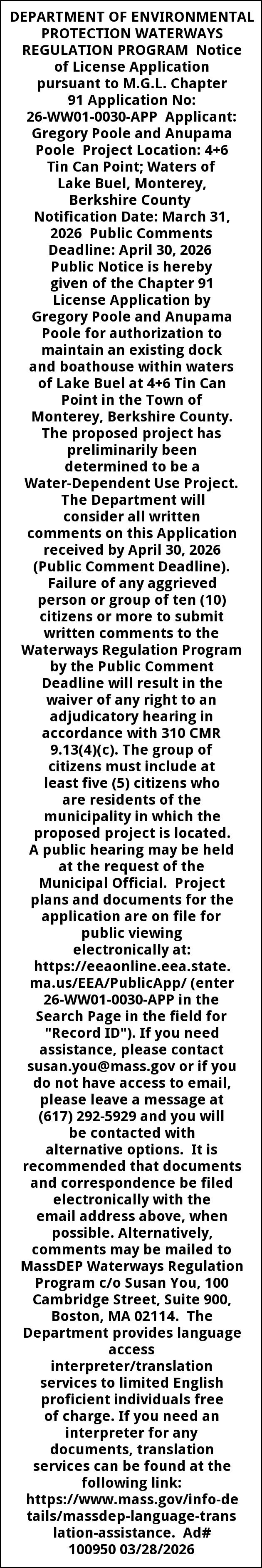 DEPARTMENT OF ENVIRONMENTAL PROTECTION WATERWAYS REGULATION PROGRAM Notice of License Application pursuant to M.G.L. Chapter 91 Application No: 26-WW01-0030-APP Applicant: Gregory Poole and Anupama Poole Project Location: 4+6 Tin Can Point; Waters of Lake Buel, Monterey, Berkshire County Notification Date: March 31, 2026 Public Comments Deadline: April 30, 2026 Public Notice is hereby given of the Chapter 91 License Application by Gregory Poole and Anupama Poole for authorization to maintain an existing dock and boathouse within waters of Lake Buel at 4+6 Tin Can Point in the Town of Monterey, Berkshire County. The proposed project has preliminarily been determined to be a Water-Dependent Use Project. The Department will consider all written comments on this Application received by April 30, 2026 (Public Comment Deadline). Failure of any aggrieved person or group of ten (10) citizens or more to submit written comments to the Waterways Regulation Program by the Public Comment Deadline will result in the waiver of any right to an adjudicatory hearing in accordance with 310 CMR 9.13(4)(c). The group of citizens must include at least five (5) citizens who are residents of the municipality in which the proposed project is located. A public hearing may be held at the request of the Municipal Official. Project plans and documents for the application are on file for public viewing electronically at: https://eeaonline.eea.state.ma.us/EEA/PublicApp/ (enter 26-WW01-0030-APP in the Search Page in the field for "Record ID"). If you need assistance, please contact susan.you@mass.gov or if you do not have access to email, please leave a message at (617) 292-5929 and you will be contacted with alternative options. It is recommended that documents and correspondence be filed electronically with the email address above, when possible. Alternatively, comments may be mailed to MassDEP Waterways Regulation Program c/o Susan You, 100 Cambridge Street, Suite 900, Boston, MA 02114. The Department provides language access interpreter/translation services to limited English proficient individuals free of charge. If you need an interpreter for any documents, translation services can be found at the following link: https://www.mass.gov/info-details/massdep-language-translation-assistance. Ad# 100950 03/28/2026