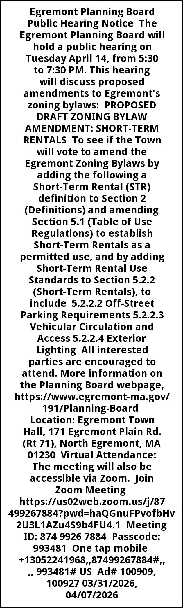 Egremont Planning Board Public Hearing Notice The Egremont Planning Board will hold a public hearing on Tuesday April 14, from 5:30 to 7:30 PM. This hearing will discuss proposed amendments to Egremont's zoning bylaws: PROPOSED DRAFT ZONING BYLAW AMENDMENT: SHORT-TERM RENTALS To see if the Town will vote to amend the Egremont Zoning Bylaws by adding the following a Short-Term Rental (STR) definition to Section 2 (Definitions) and amending Section 5.1 (Table of Use Regulations) to establish Short-Term Rentals as a permitted use, and by adding Short-Term Rental Use Standards to Section 5.2.2 (Short-Term Rentals), to include 5.2.2.2 Off-Street Parking Requirements 5.2.2.3 Vehicular Circulation and Access 5.2.2.4 Exterior Lighting All interested parties are encouraged to attend. More information on the Planning Board webpage, https://www.egremont-ma.gov/191/Planning-Board Location: Egremont Town Hall, 171 Egremont Plain Rd. (Rt 71), North Egremont, MA 01230 Virtual Attendance: The meeting will also be accessible via Zoom. Join Zoom Meeting https://us02web.zoom.us/j/87499267884?pwd=haQGnuFPvofbHv2U3L1AZu4S9b4FU4.1 Meeting ID: 874 9926 7884 Passcode: 993481 One tap mobile +13052241968,,87499267884#,,,, 993481# US Ad# 100909, 100927 03/31/2026, 04/07/2026