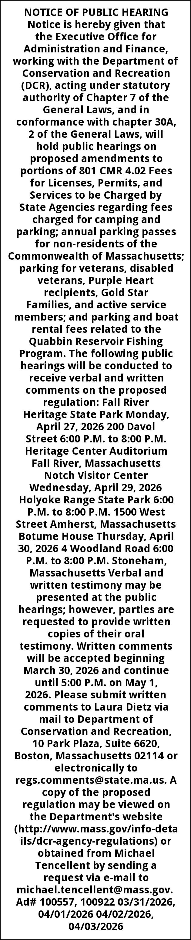 NOTICE OF PUBLIC HEARING Notice is hereby given that the Executive Office for Administration and Finance, working with the Department of Conservation and Recreation (DCR), acting under statutory authority of Chapter 7 of the General Laws, and in conformance with chapter 30A, 2 of the General Laws, will hold public hearings on proposed amendments to portions of 801 CMR 4.02 Fees for Licenses, Permits, and Services to be Charged by State Agencies regarding fees charged for camping and parking; annual parking passes for non-residents of the Commonwealth of Massachusetts; parking for veterans, disabled veterans, Purple Heart recipients, Gold Star Families, and active service members; and parking and boat rental fees related to the Quabbin Reservoir Fishing Program. The following public hearings will be conducted to receive verbal and written comments on the proposed regulation: Fall River Heritage State Park Monday, April 27, 2026 200 Davol Street 6:00 P.M. to 8:00 P.M. Heritage Center Auditorium Fall River, Massachusetts Notch Visitor Center Wednesday, April 29, 2026 Holyoke Range State Park 6:00 P.M. to 8:00 P.M. 1500 West Street Amherst, Massachusetts Botume House Thursday, April 30, 2026 4 Woodland Road 6:00 P.M. to 8:00 P.M. Stoneham, Massachusetts Verbal and written testimony may be presented at the public hearings; however, parties are requested to provide written copies of their oral testimony. Written comments will be accepted beginning March 30, 2026 and continue until 5:00 P.M. on May 1, 2026. Please submit written comments to Laura Dietz via mail to Department of Conservation and Recreation, 10 Park Plaza, Suite 6620, Boston, Massachusetts 02114 or electronically to regs.comments@state.ma.us. A copy of the proposed regulation may be viewed on the Department's website (http://www.mass.gov/info-details/dcr-agency-regulations) or obtained from Michael Tencellent by sending a request via e-mail to michael.tencellent@mass.gov. Ad# 100557, 100922 03/31/2026, 04/01/2026 04/02/2026, 04/03/2026
