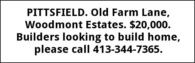 PITTSFIELD. Old Farm Lane, Woodmont Estates. $20,000. Builders looking to build home, please call 413-344-7365.