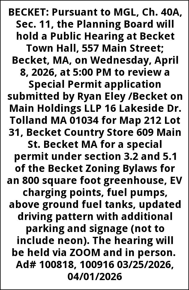 BECKET: Pursuant to MGL, Ch. 40A, Sec. 11, the Planning Board will hold a Public Hearing at Becket Town Hall, 557 Main Street; Becket, MA, on Wednesday, April 8, 2026, at 5:00 PM to review a Special Permit application submitted by Ryan Eley /Becket on Main Holdings LLP 16 Lakeside Dr. Tolland MA 01034 for Map 212 Lot 31, Becket Country Store 609 Main St. Becket MA for a special permit under section 3.2 and 5.1 of the Becket Zoning Bylaws for an 800 square foot greenhouse, EV charging points, fuel pumps, above ground fuel tanks, updated driving pattern with additional parking and signage (not to include neon). The hearing will be held via ZOOM and in person. Ad# 100818, 100916 03/25/2026, 04/01/2026