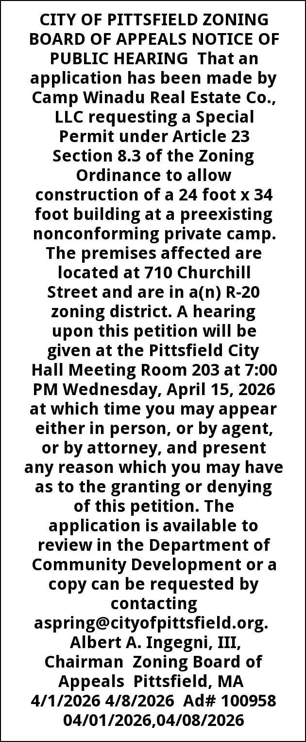 CITY OF PITTSFIELD ZONING BOARD OF APPEALS NOTICE OF PUBLIC HEARING That an application has been made by Camp Winadu Real Estate Co., LLC requesting a Special Permit under Article 23 Section 8.3 of the Zoning Ordinance to allow construction of a 24 foot x 34 foot building at a preexisting nonconforming private camp. The premises affected are located at 710 Churchill Street and are in a(n) R-20 zoning district. A hearing upon this petition will be given at the Pittsfield City Hall Meeting Room 203 at 7:00 PM Wednesday, April 15, 2026 at which time you may appear either in person, or by agent, or by attorney, and present any reason which you may have as to the granting or denying of this petition. The application is available to review in the Department of Community Development or a copy can be requested by contacting aspring@cityofpittsfield.org. Albert A. Ingegni, III, Chairman Zoning Board of Appeals Pittsfield, MA 4/1/2026 4/8/2026 Ad# 100958 04/01/2026,04/08/2026