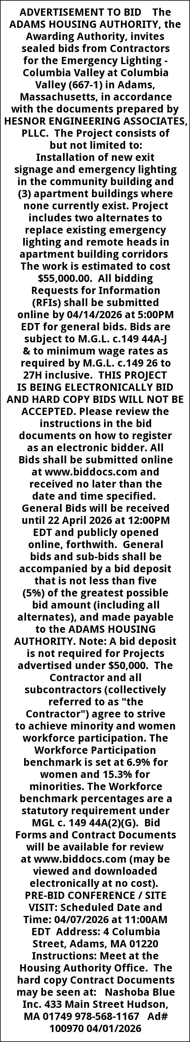 ADVERTISEMENT TO BID The ADAMS HOUSING AUTHORITY, the Awarding Authority, invites sealed bids from Contractors for the Emergency Lighting - Columbia Valley at Columbia Valley (667-1) in Adams, Massachusetts, in accordance with the documents prepared by HESNOR ENGINEERING ASSOCIATES, PLLC. The Project consists of but not limited to: Installation of new exit signage and emergency lighting in the community building and (3) apartment buildings where none currently exist. Project includes two alternates to replace existing emergency lighting and remote heads in apartment building corridors The work is estimated to cost $55,000.00. All bidding Requests for Information (RFIs) shall be submitted online by 04/14/2026 at 5:00PM EDT for general bids. Bids are subject to M.G.L. c.149 44A-J & to minimum wage rates as required by M.G.L. c.149 26 to 27H inclusive. THIS PROJECT IS BEING ELECTRONICALLY BID AND HARD COPY BIDS WILL NOT BE ACCEPTED. Please review the instructions in the bid documents on how to register as an electronic bidder. All Bids shall be submitted online at www.biddocs.com and received no later than the date and time specified. General Bids will be received until 22 April 2026 at 12:00PM EDT and publicly opened online, forthwith. General bids and sub-bids shall be accompanied by a bid deposit that is not less than five (5%) of the greatest possible bid amount (including all alternates), and made payable to the ADAMS HOUSING AUTHORITY. Note: A bid deposit is not required for Projects advertised under $50,000. The Contractor and all subcontractors (collectively referred to as "the Contractor") agree to strive to achieve minority and women workforce participation. The Workforce Participation benchmark is set at 6.9% for women and 15.3% for minorities. The Workforce benchmark percentages are a statutory requirement under MGL c. 149 44A(2)(G). Bid Forms and Contract Documents will be available for review at www.biddocs.com (may be viewed and downloaded electronically at no cost). PRE-BID CONFERENCE / SITE VISIT: Scheduled Date and Time: 04/07/2026 at 11:00AM EDT Address: 4 Columbia Street, Adams, MA 01220 Instructions: Meet at the Housing Authority Office. The hard copy Contract Documents may be seen at: Nashoba Blue Inc. 433 Main Street Hudson, MA 01749 978-568-1167 Ad# 100970 04/01/2026
