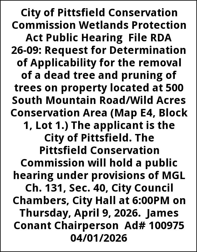City of Pittsfield Conservation Commission Wetlands Protection Act Public Hearing File RDA 26-09: Request for Determination of Applicability for the removal of a dead tree and pruning of trees on property located at 500 South Mountain Road/Wild Acres Conservation Area (Map E4, Block 1, Lot 1.) The applicant is the City of Pittsfield. The Pittsfield Conservation Commission will hold a public hearing under provisions of MGL Ch. 131, Sec. 40, City Council Chambers, City Hall at 6:00PM on Thursday, April 9, 2026. James Conant Chairperson Ad# 100975 04/01/2026