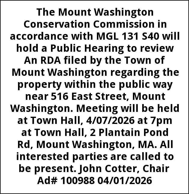The Mount Washington Conservation Commission in accordance with MGL 131 S40 will hold a Public Hearing to review An RDA filed by the Town of Mount Washington regarding the property within the public way near 516 East Street, Mount Washington. Meeting will be held at Town Hall, 4/07/2026 at 7pm at Town Hall, 2 Plantain Pond Rd, Mount Washington, MA. All interested parties are called to be present. John Cotter, Chair Ad# 100988 04/01/2026